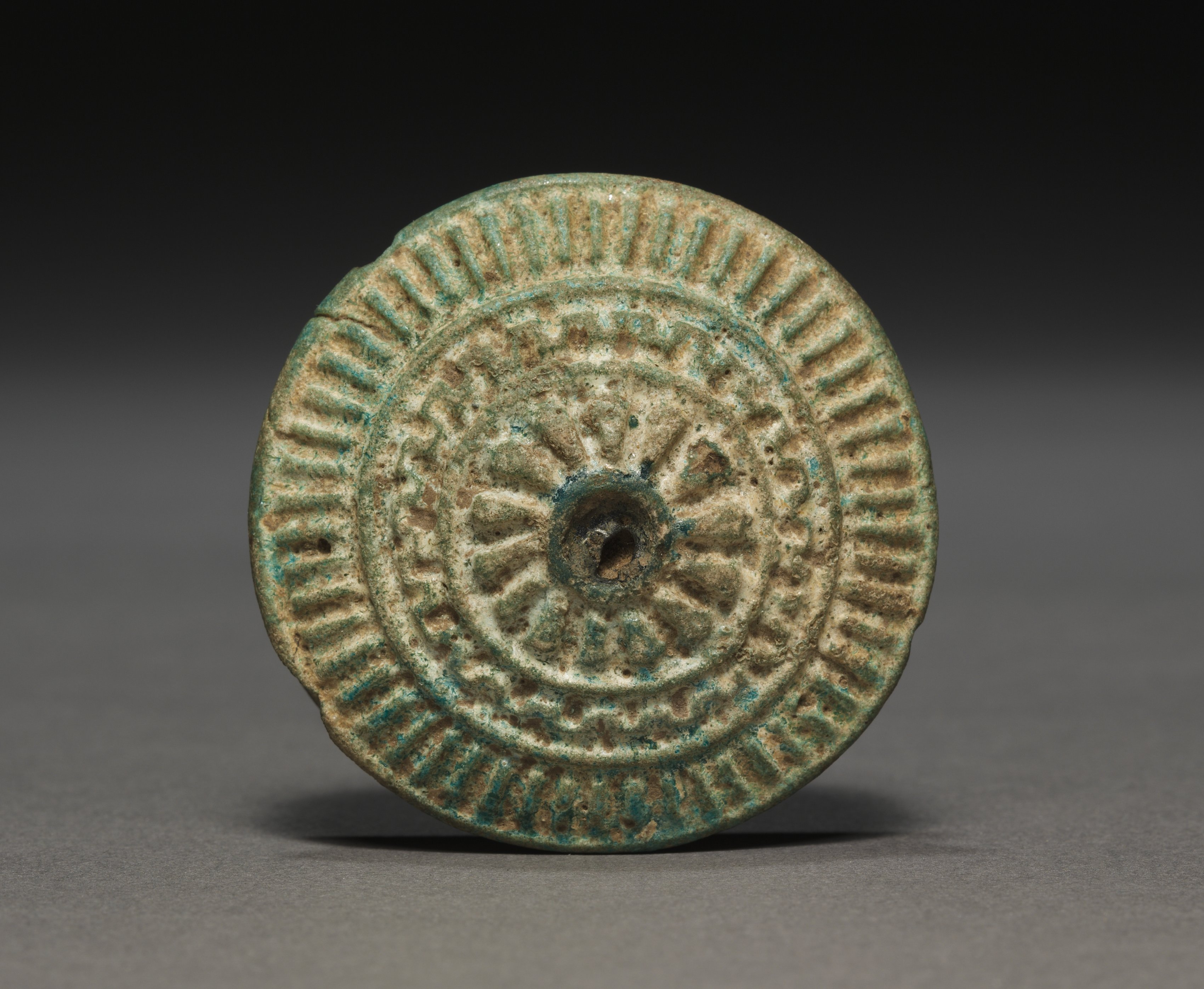 The image shows a circular, bronze earring titled "Ear Stud" by an unknown artist. The earring features a central hole surrounded by a sunburst pattern. A second, solid circle with a decorative border encircles the sunburst, and a third circle with a ridged border encircles the second. The earring has a green patina and appears to be ancient. The background is dark gray, transitioning to black at the top and a lighter gray at the bottom, with the earring casting a subtle shadow.