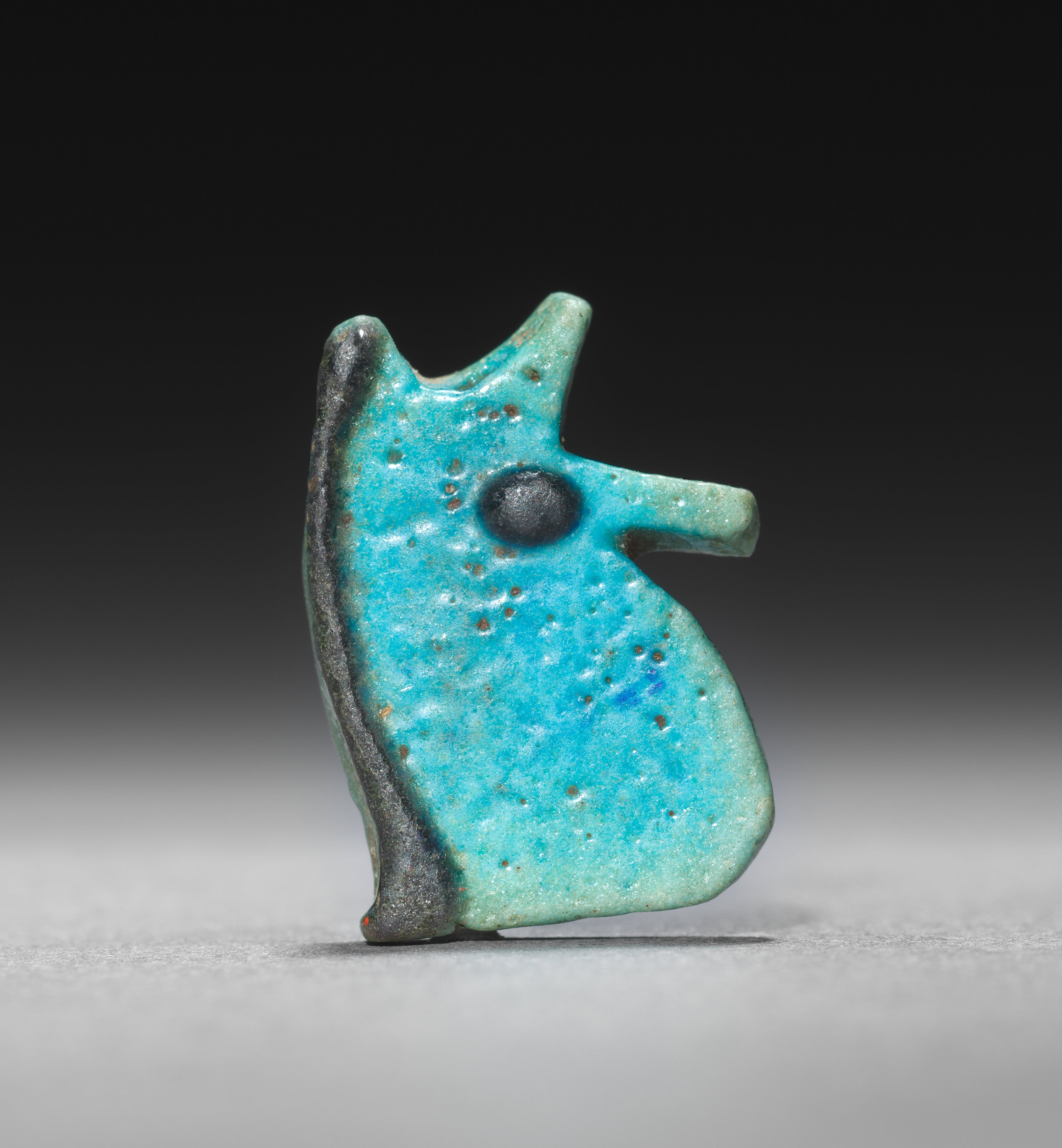 Eye of Horus Amulet by artist. Glazed blue faience amulet in the shape of the eye of Horus; one side is flat while the other is rounded; the eye is black; glaze appears speckled; the glaze on the right side fades to green; edge on the left side is dark; from ancient Egypt.