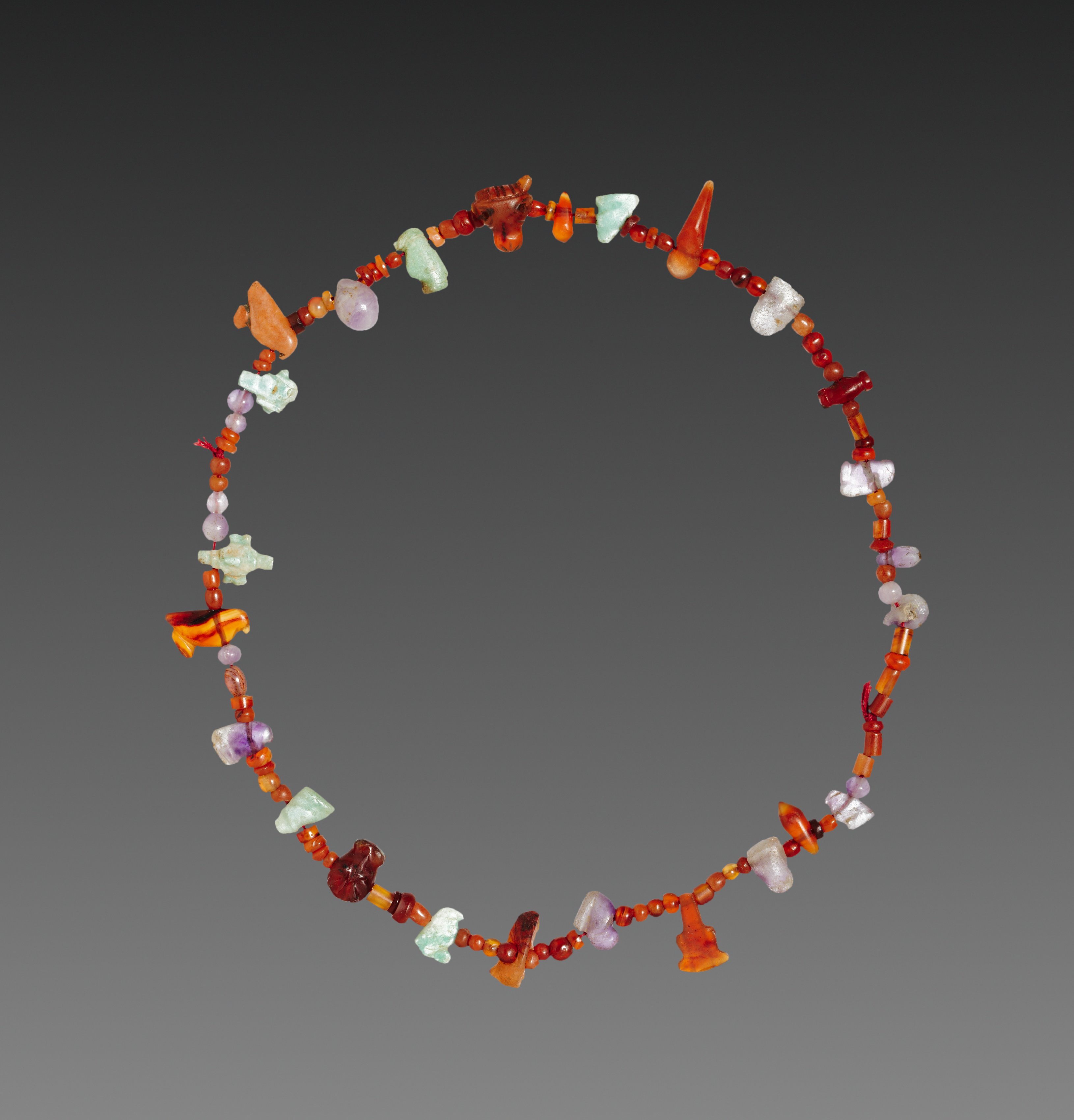 Necklace of Amulets by artist. Necklace made of orange, red, and white beads and irregularly shaped stones. The necklace is circular. The beads are small and round. The stones are irregularly shaped and vary in color, including orange, red, white, and purple. The necklace has no clasp. The background is gray and darkens towards the top.