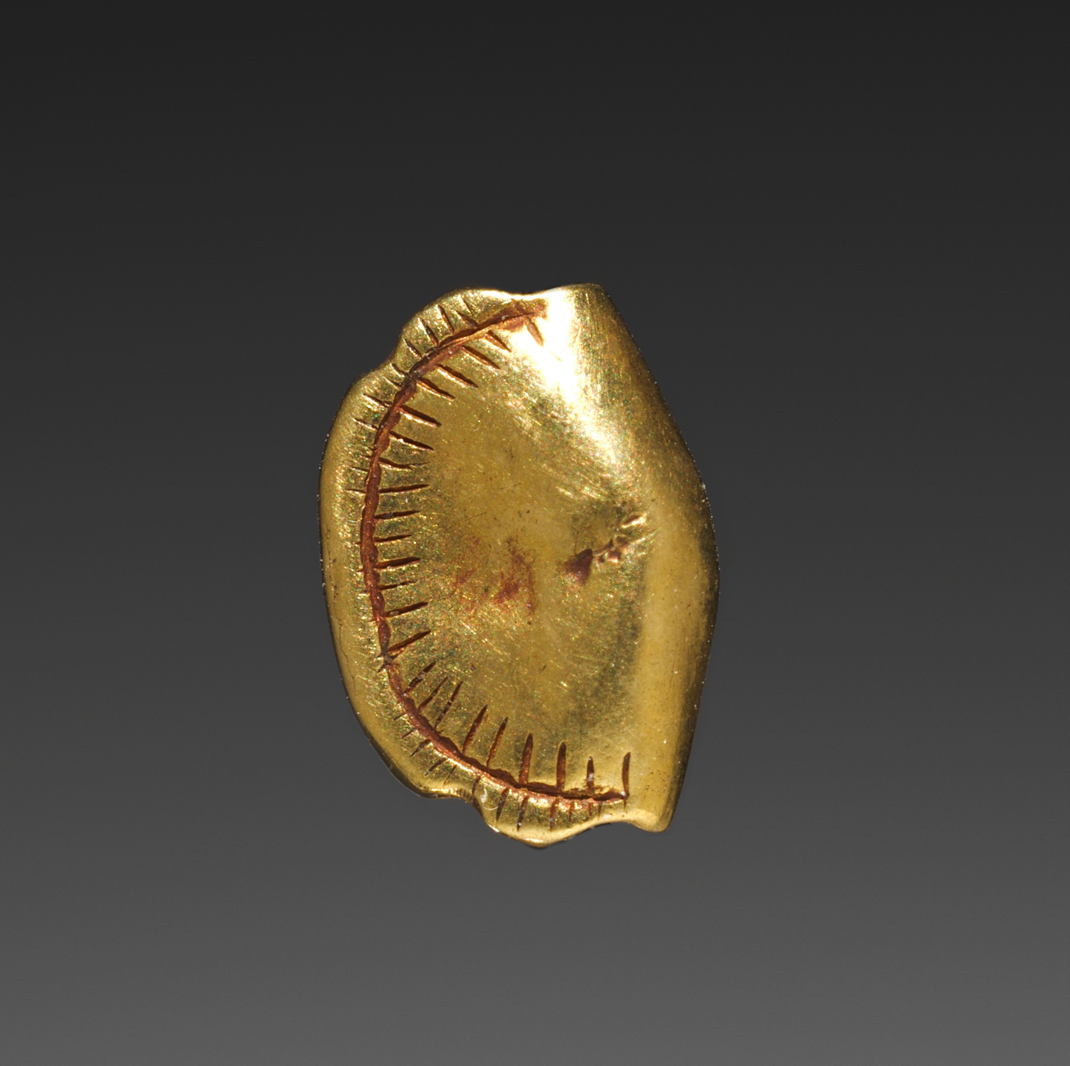 Golden-colored metal object, irregularly shaped, resembling a leaf or an oval with one side curved and the other irregular; surface smooth with visible scratches and marks; red stitching-like pattern around the edge; background dark gray gradient. Wallet Bead by artist.