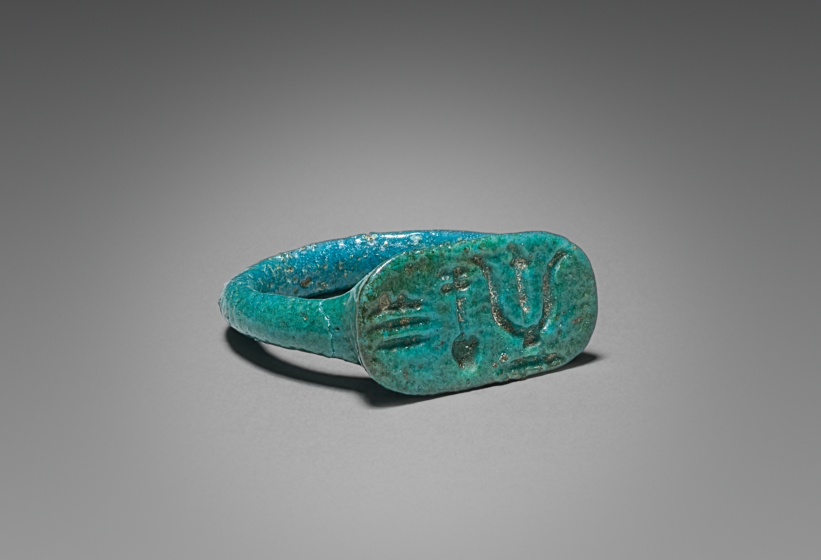 The image shows a green ring. The band of the ring is rounded and smooth. The bezel is wider and relatively flat, with Egyptian hieroglyphics etched into it. The ring is lying on its side, showing the rounded band behind the wider bezel. The green patina of the ring's surface displays discoloration and spots. The background is gray. The title of the image is "New Year's Ring".