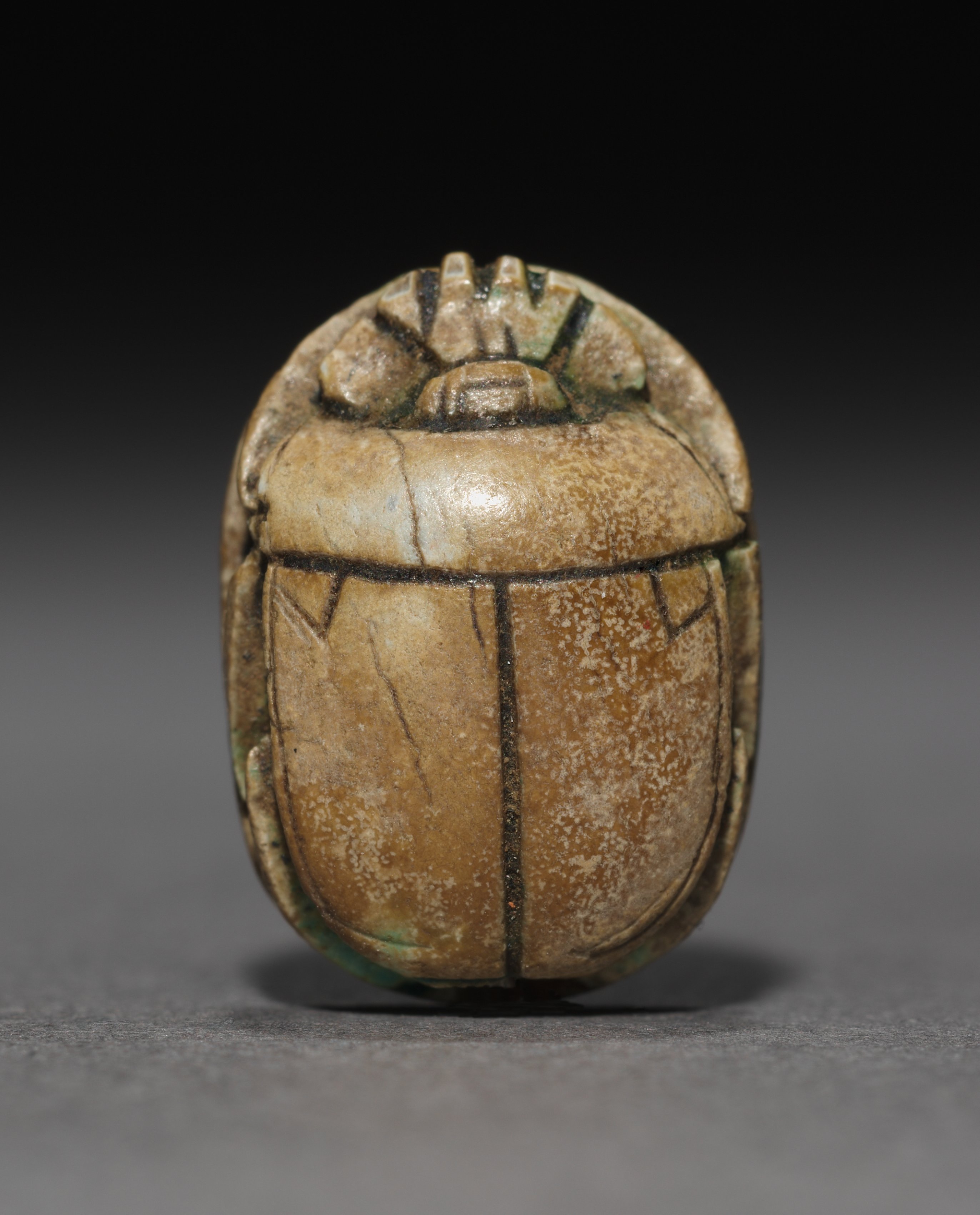 The Amenhotep II Scarab is a beige-colored beetle-shaped object with a flat bottom and rounded top. The top has a raised section resembling a beetle's head and thorax. The object has black lines etched into it, forming the shape of a beetle's body and legs. The surface is weathered with white spots and there are hints of green on the sides. The background is dark gray to black, with the object casting a shadow.