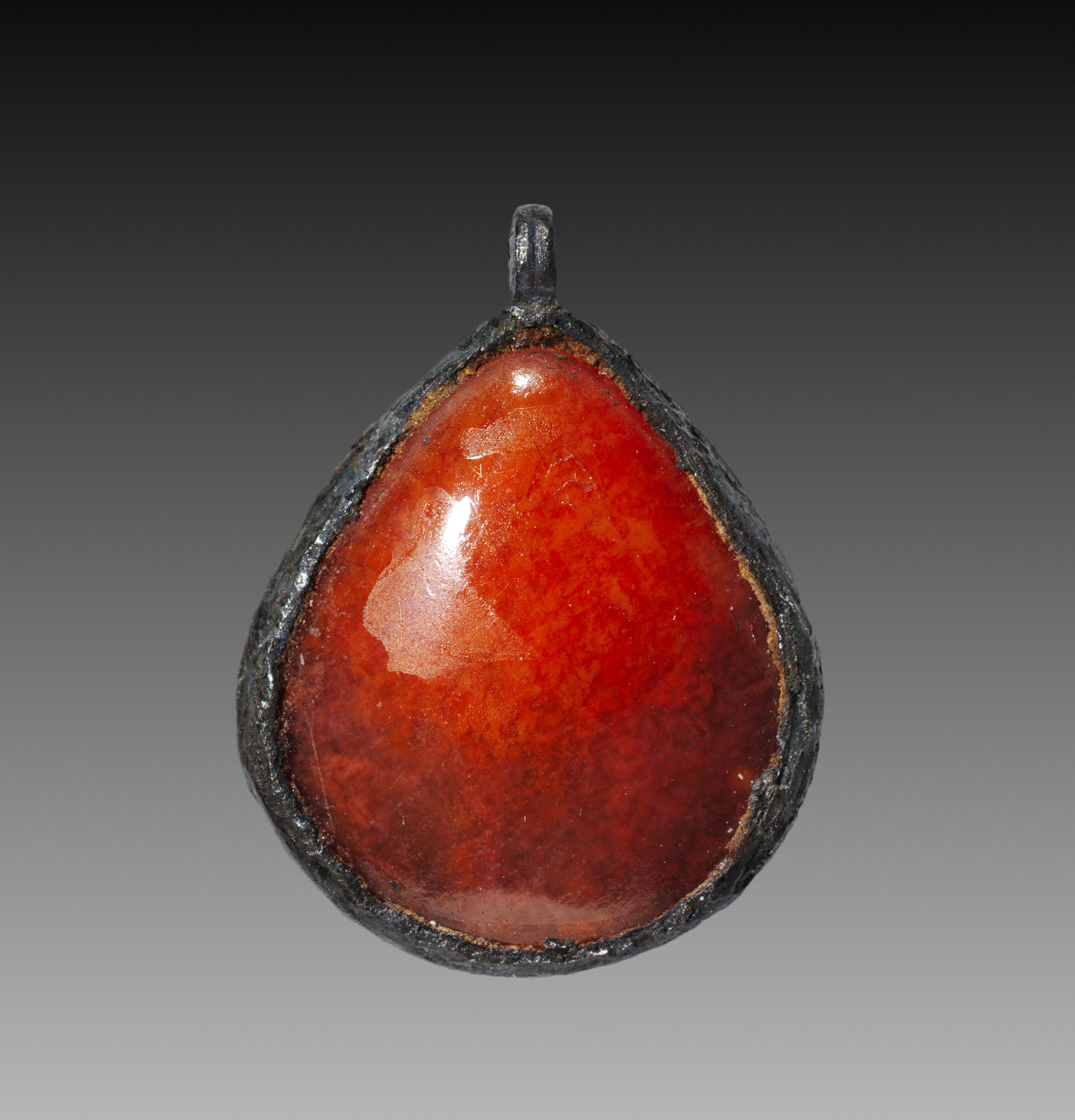 Teardrop-shaped pendant with a red-orange stone, likely carnelian, with a smooth glossy surface and darker orange-red hues around the edges; the stone is surrounded by a thin black metal frame with a small loop at the top.