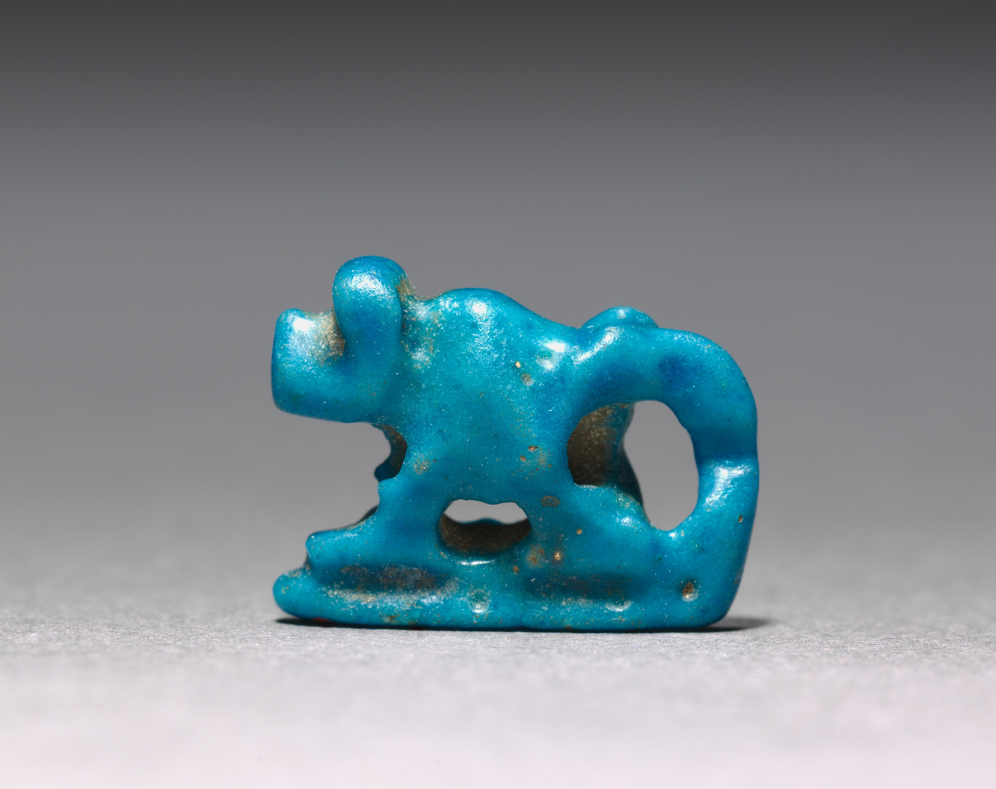 The image shows a small, blue-colored object titled "Amulets" by an unknown artist. The object is made of a bright blue material, possibly stone or glass, with a glossy finish. It is shaped like an animal with a long tail curled around to the right side and a bulbous protrusion on the top left. The object has a rough texture and appears to be small enough to be held between two fingers. The object has several holes and pits on its surface, giving it a worn and aged appearance. The background of the image is a gradient of gray, with the object sitting on a flat surface that is lighter in color than the background. The object is positioned in the center of the image, with the front facing slightly to the left. The overall appearance of the object suggests that it may be an ancient artifact or a piece of jewelry.