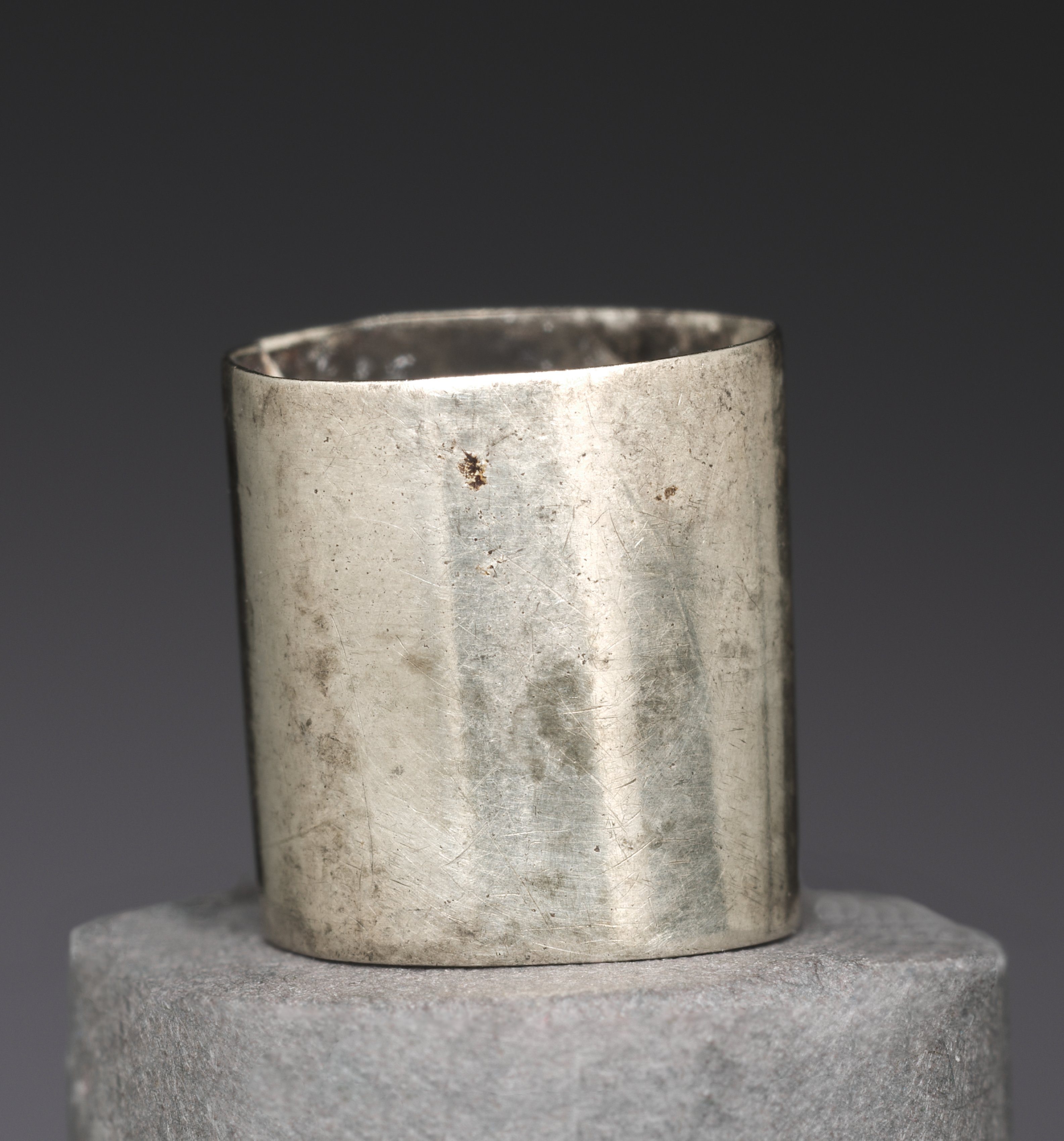 The Element of Wig Decoration by the artist features a cylindrical metal object with a wide, flat top and bottom. The object is made of a silver-colored metal, exhibiting a scratched and worn appearance with visible signs of aging and use. It has a smooth, rounded interior surface and a slightly rough exterior surface. The object is positioned on top of a gray, rectangular pedestal with a flat top. The background is a dark gray color, gradually transitioning to black towards the edges.