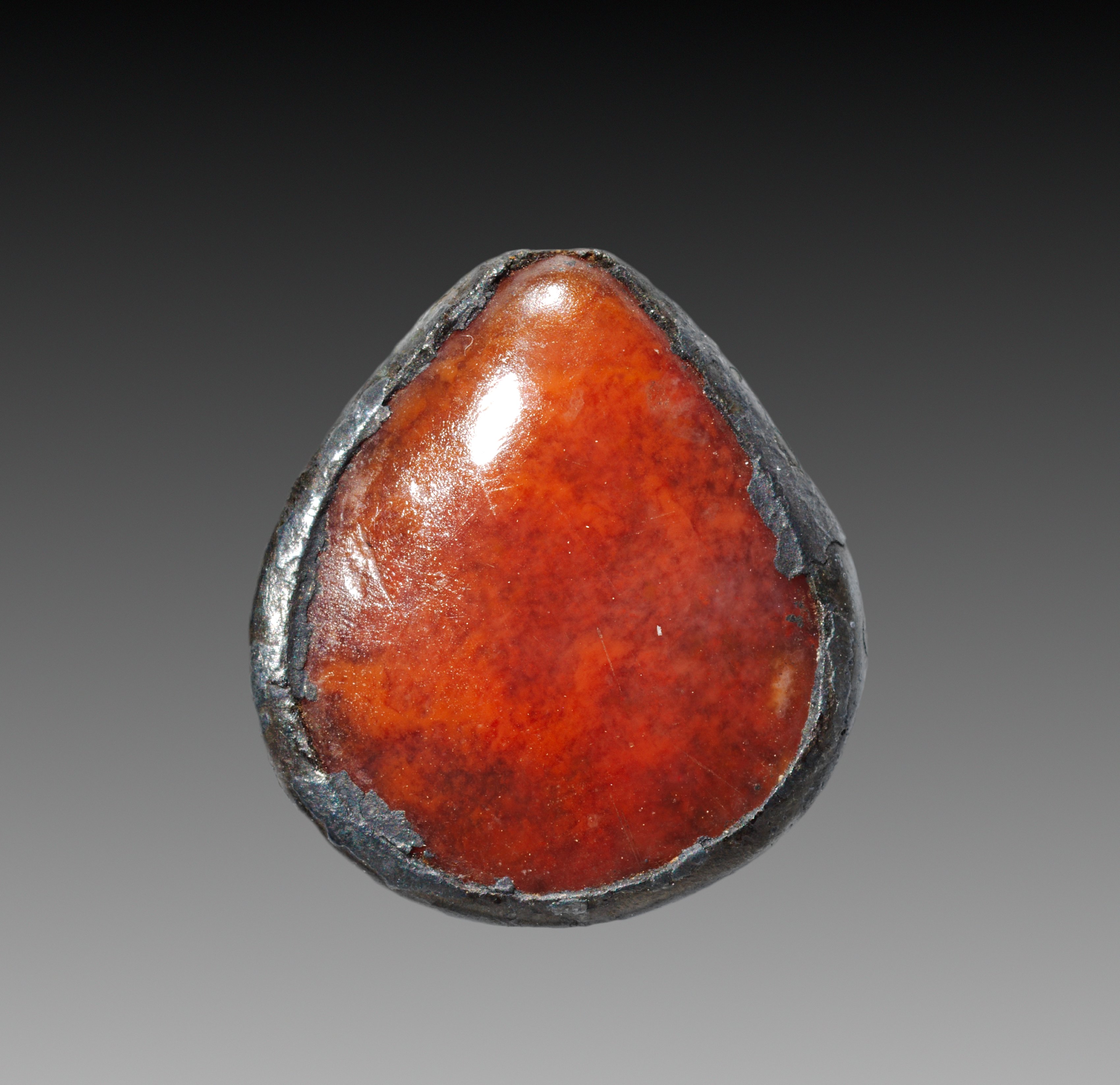 Oyster-Shell Pendant by artist unknown. Teardrop-shaped pendant with a reddish-orange stone, resembling an oyster shell, set in a dark metal frame with a rough, uneven edge. The stone has a glossy finish and exhibits darker orange and reddish-brown speckles throughout. The metal frame appears to be oxidized, with a dark grey to black color. The pendant is centered on a gradient background that transitions from dark grey at the top to light grey at the bottom.