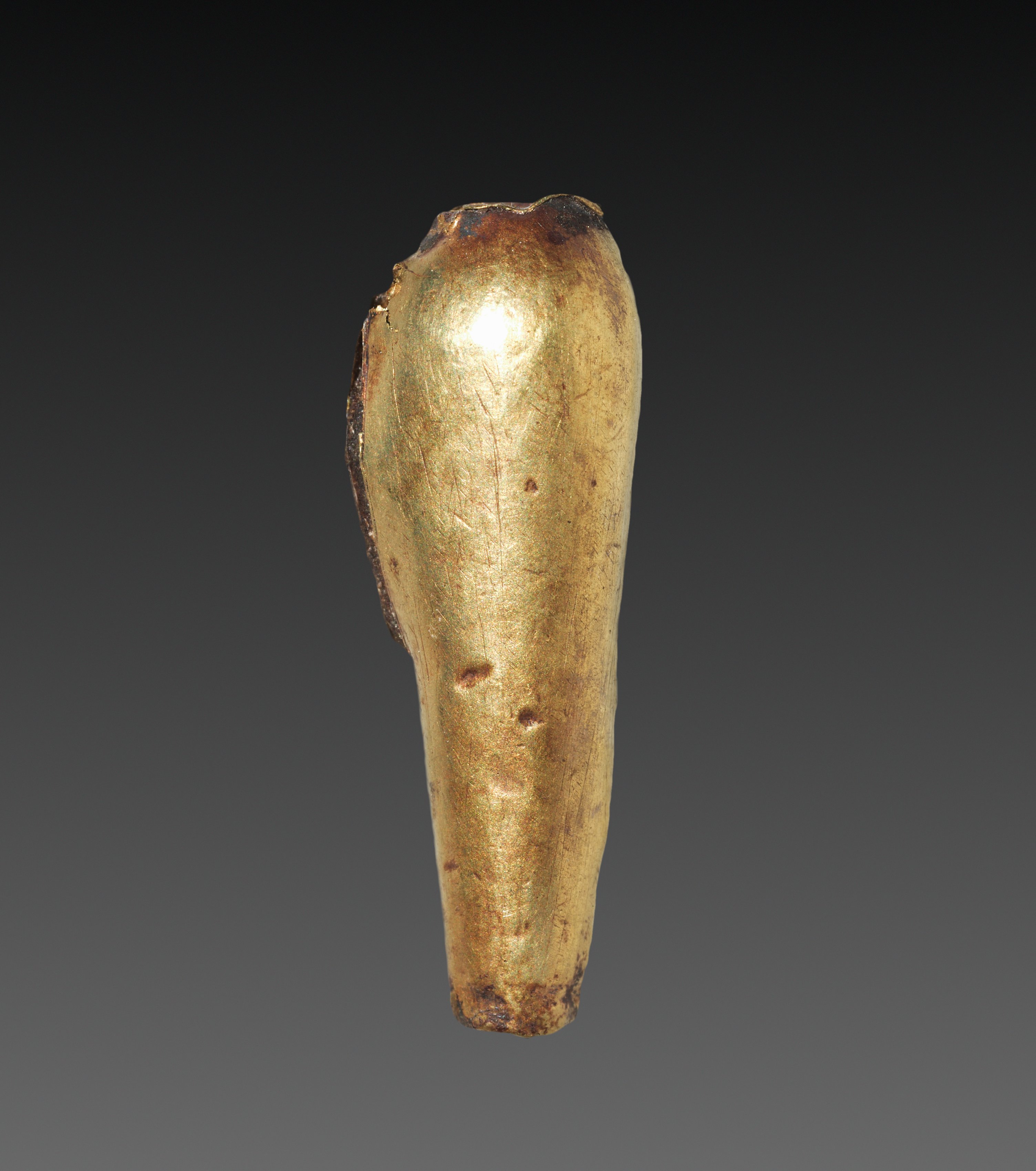 Teardrop-Shaped Bead by Unknown. The object is a teardrop-shaped bead made of gold-colored material. The bead has a smooth surface with visible scratches and marks. It is elongated with a rounded top that tapers to a narrower bottom. The top edge appears rough and irregular. There are dark spots and discoloration on the surface, particularly around the edges and bottom. The background is a gradient from dark gray at the top to light gray at the bottom.