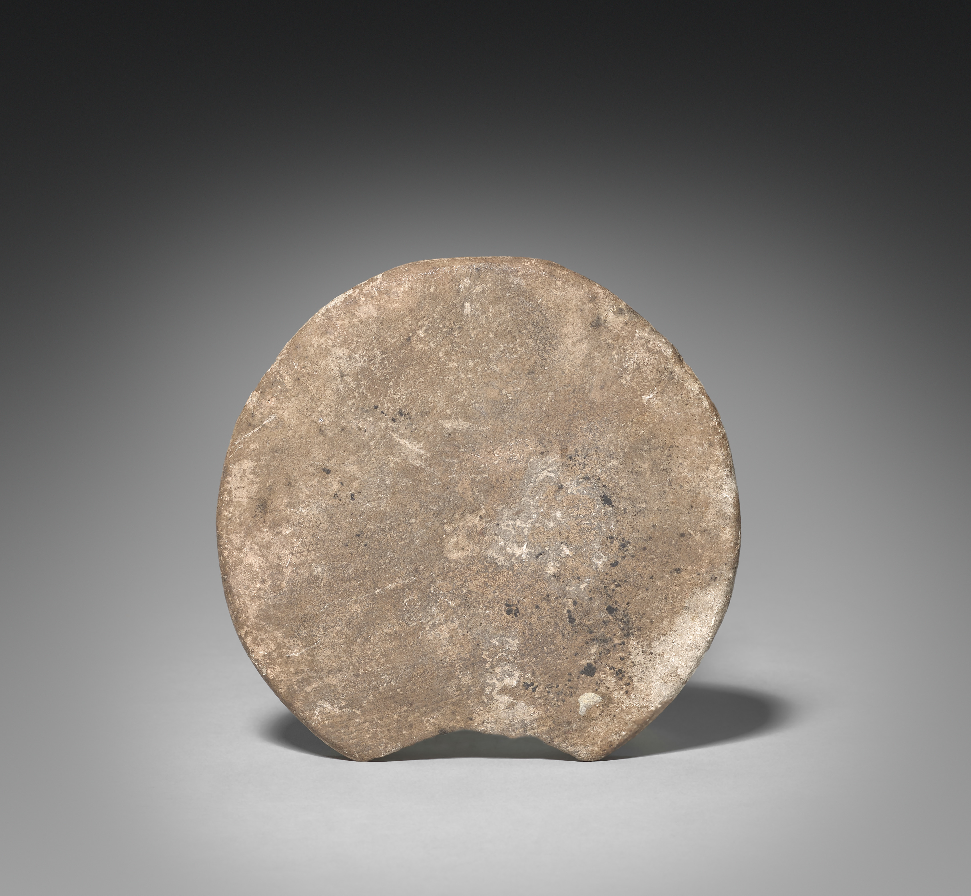 Round, flat object with a rough texture and light brown color. Object has a slightly irregular shape with a small notch at the bottom edge. Surface is marked with darker brown and black spots, and has a worn appearance. Object is oriented with the notched edge facing downwards. Background is a gradient of dark gray at the top to light gray at the bottom, with a shadow cast by the object. The object is a lid.