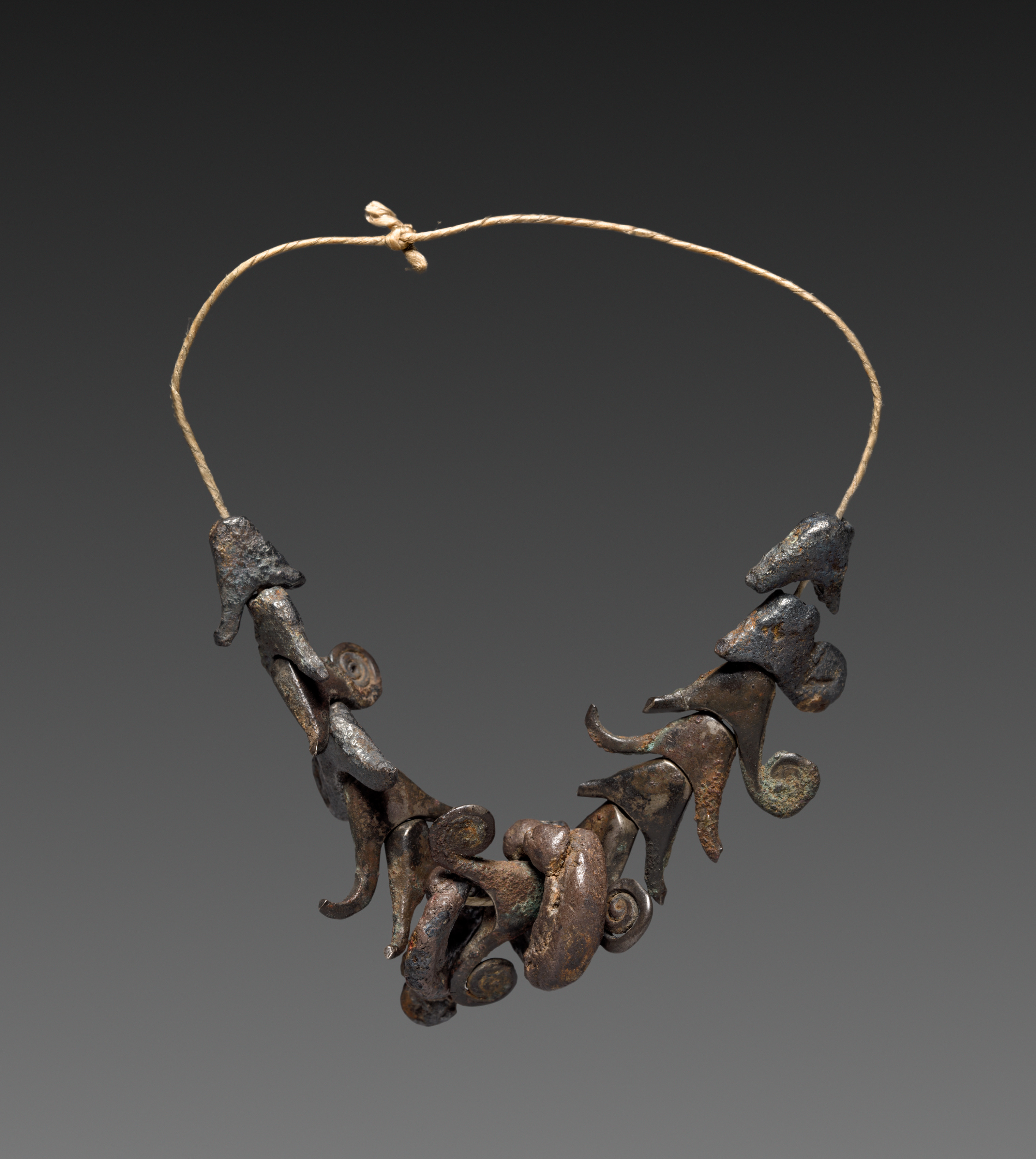 The image depicts a silver necklace titled "Silver Necklace" by an unknown artist. The necklace has a thin, tan cord that forms a rounded shape, secured with a small knot at the top. The cord is adorned with several dark-colored, abstract metal pieces that resemble animals or mythical creatures. These pieces are irregularly shaped and have a textured, organic appearance. They are arranged in a curved formation, with some pieces overlapping or connected to each other. The background of the image is a gradient of dark gray to black, providing a subtle contrast to the necklace.