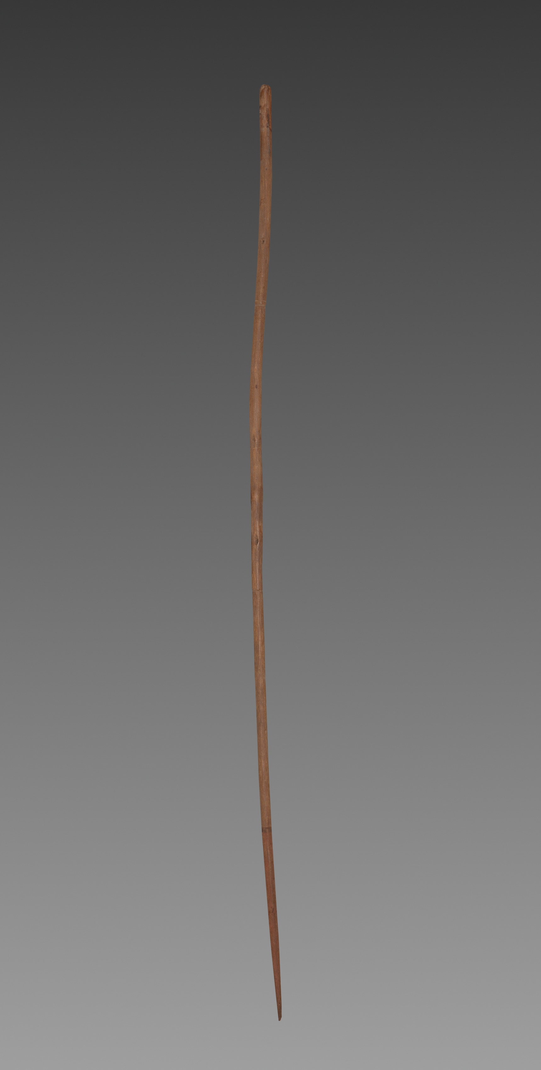Long, thin, straight wooden object with a tapered point at one end. The object is light brown with darker areas. It has a small knot or bump near the top. The background is a gradient from dark gray at the top to light gray at the bottom. The title of the image is "Arrow" by an unidentified artist.