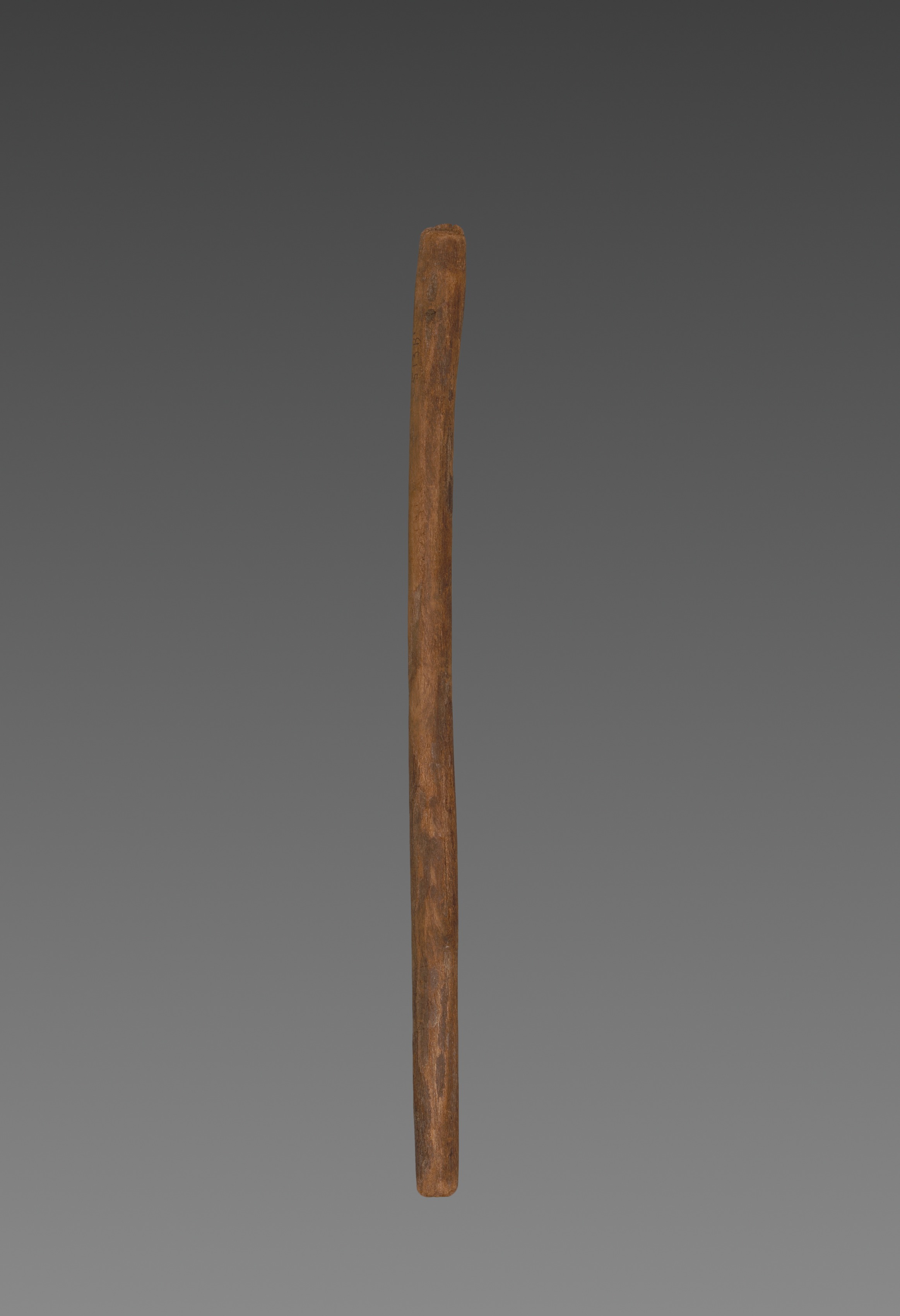 The artwork, by an unspecified artist, titled "One of Three Pieces of an Arrow", depicts a single, long, thin, cylindrical object with a rounded end at the bottom and a more irregular, roughened end at the top. The object appears to be made of wood and has a brown color with darker streaks throughout. The background of the image is a gradient that transitions from dark gray at the top to light gray at the bottom.