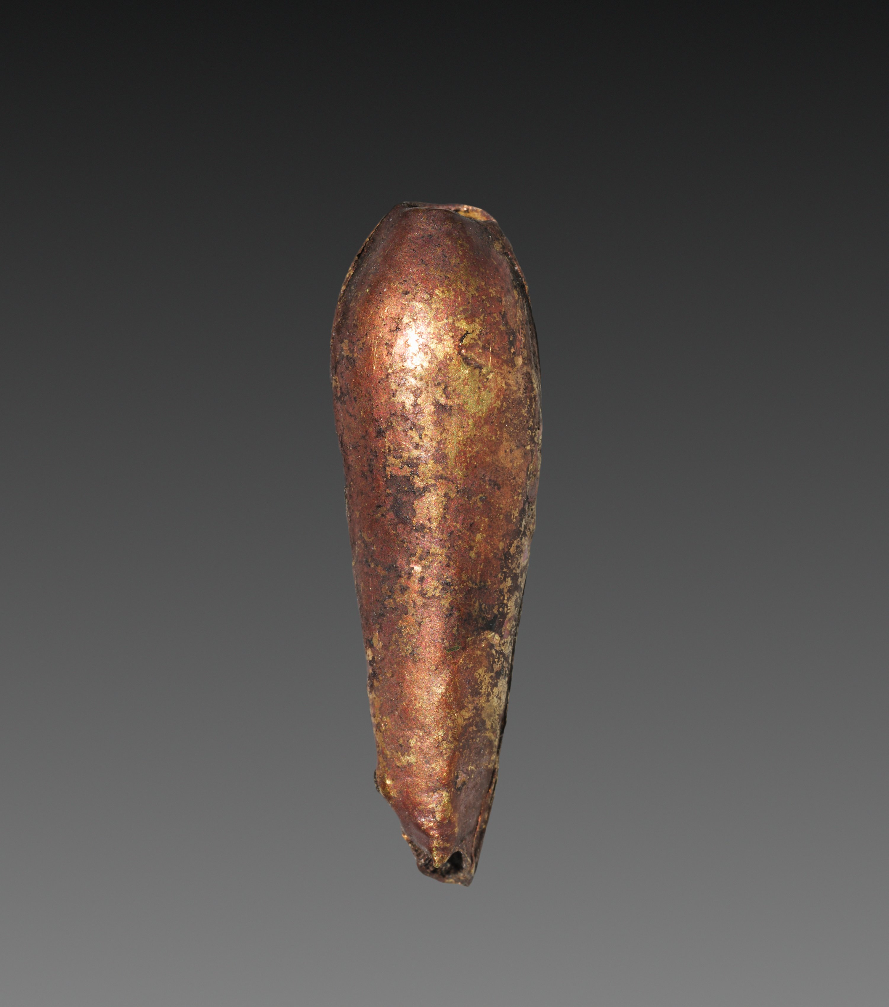 Teardrop-Shaped Bead by Unknown. The object is teardrop shaped with a small hole at the bottom. It has a reddish-brown color and appears to be made of metal. The surface is rough and has dark spots and patches of green corrosion. A bright light reflects off the top center. The background is dark gray at the top and lightens to a lighter shade towards the bottom.