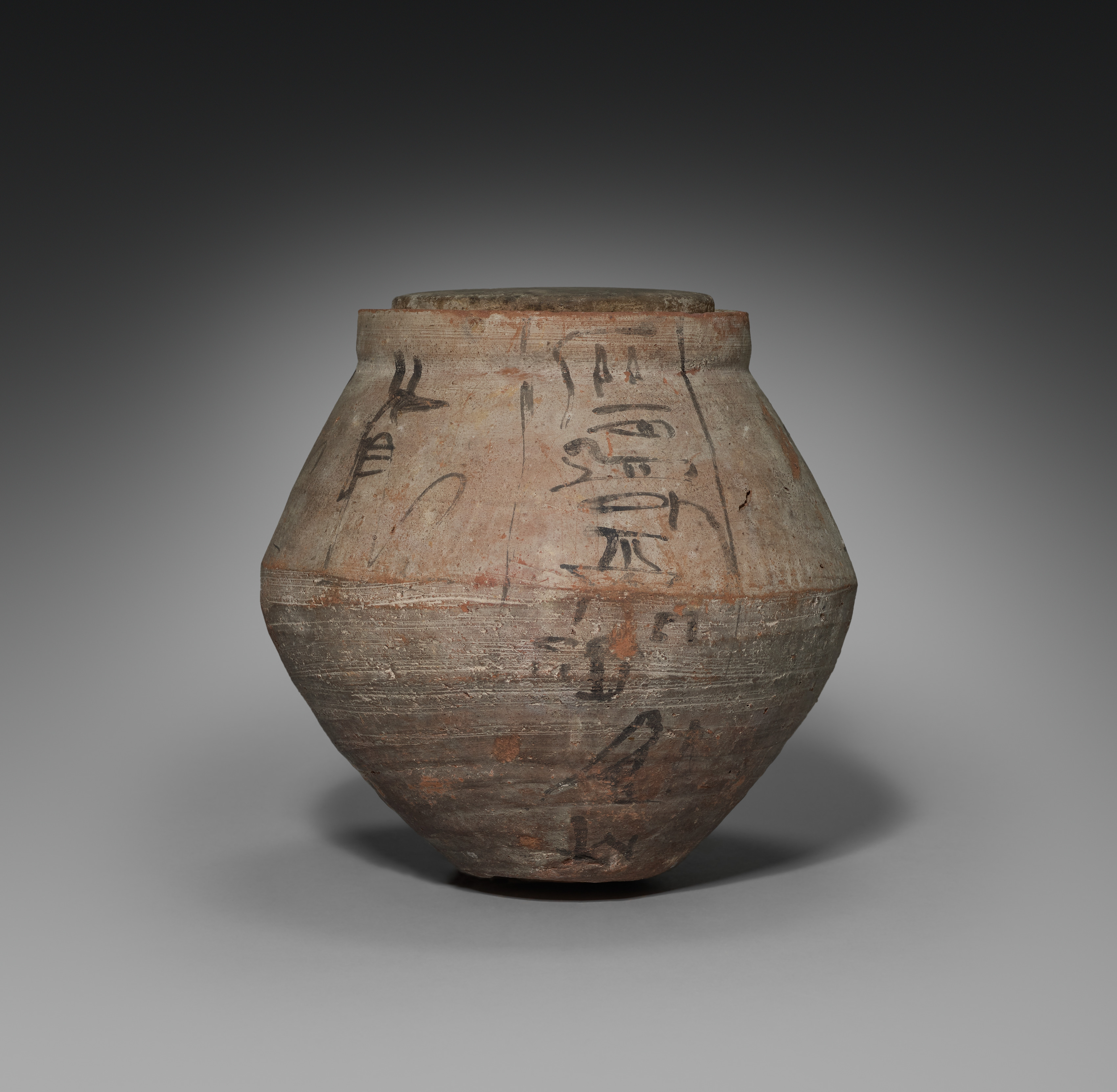 The Shawabty Jar with Lid by an unknown artist features a clay jar with a rounded body and a narrow opening at the top; the jar has a light brown color with darker brown and reddish hues. The jar has black hieroglyphics written on it. A circular groove around the top of the jar; the body has several horizontal lines etched into it. The jar casts a shadow on a gray background that fades to black at the top. The lid is not visible.