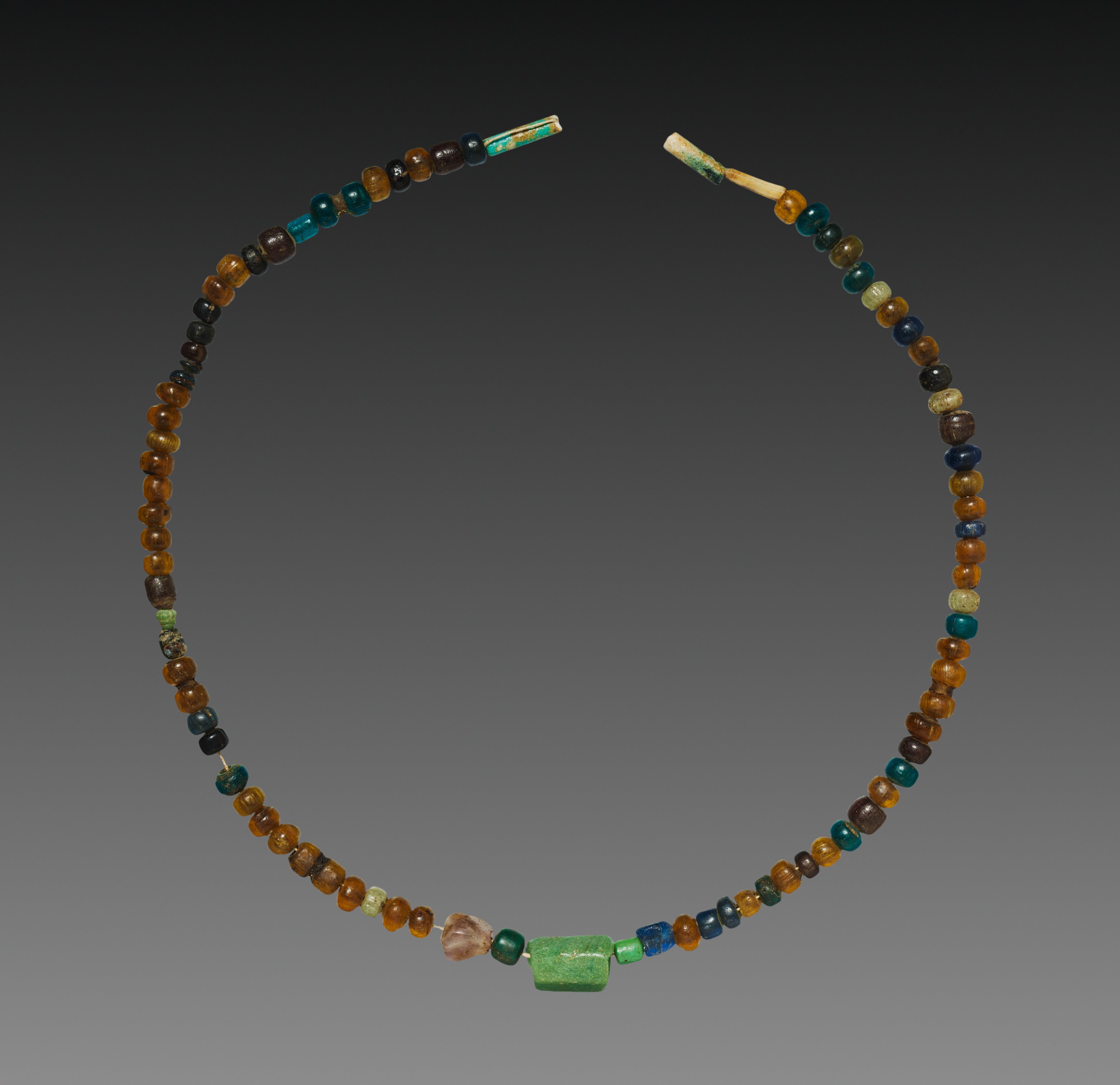 Necklace by unidentified artist. A necklace made of variously shaped and sized beads. The beads are predominantly spherical, though some are cylindrical or irregularly shaped. Colors include amber, brown, teal, green, blue, black, and tan. A cylindrical ivory or bone piece is at one end. Background is dark gray to black gradient.