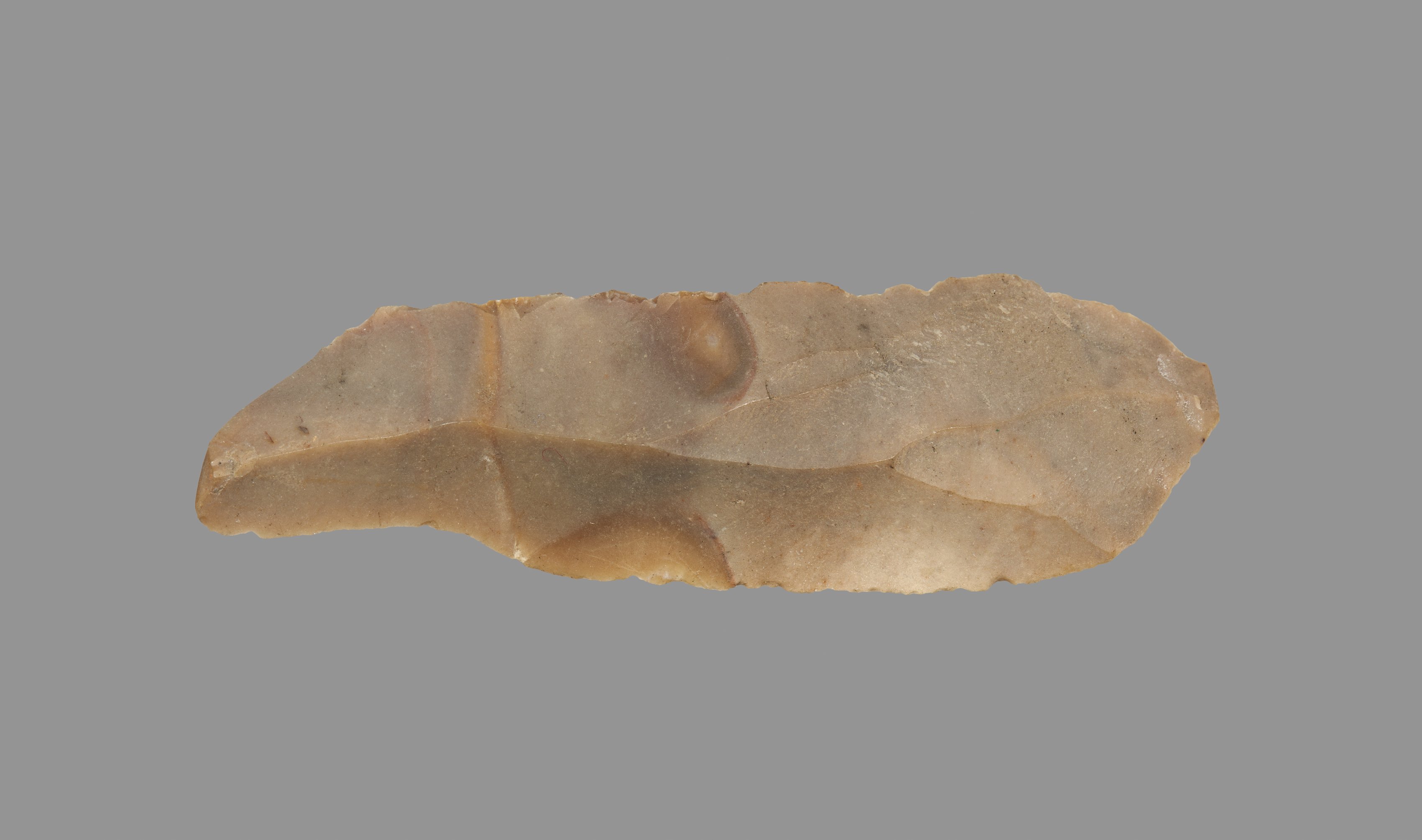 Sickle Blade by Unknown. A light brown stone tool with a serrated edge and a curved shape. The tool has a flat, wide base and tapers to a point at one end. The surface is rough and uneven, with visible ridges and grooves. The color is a uniform light brown with some darker brown undertones. The background is a solid gray color.
