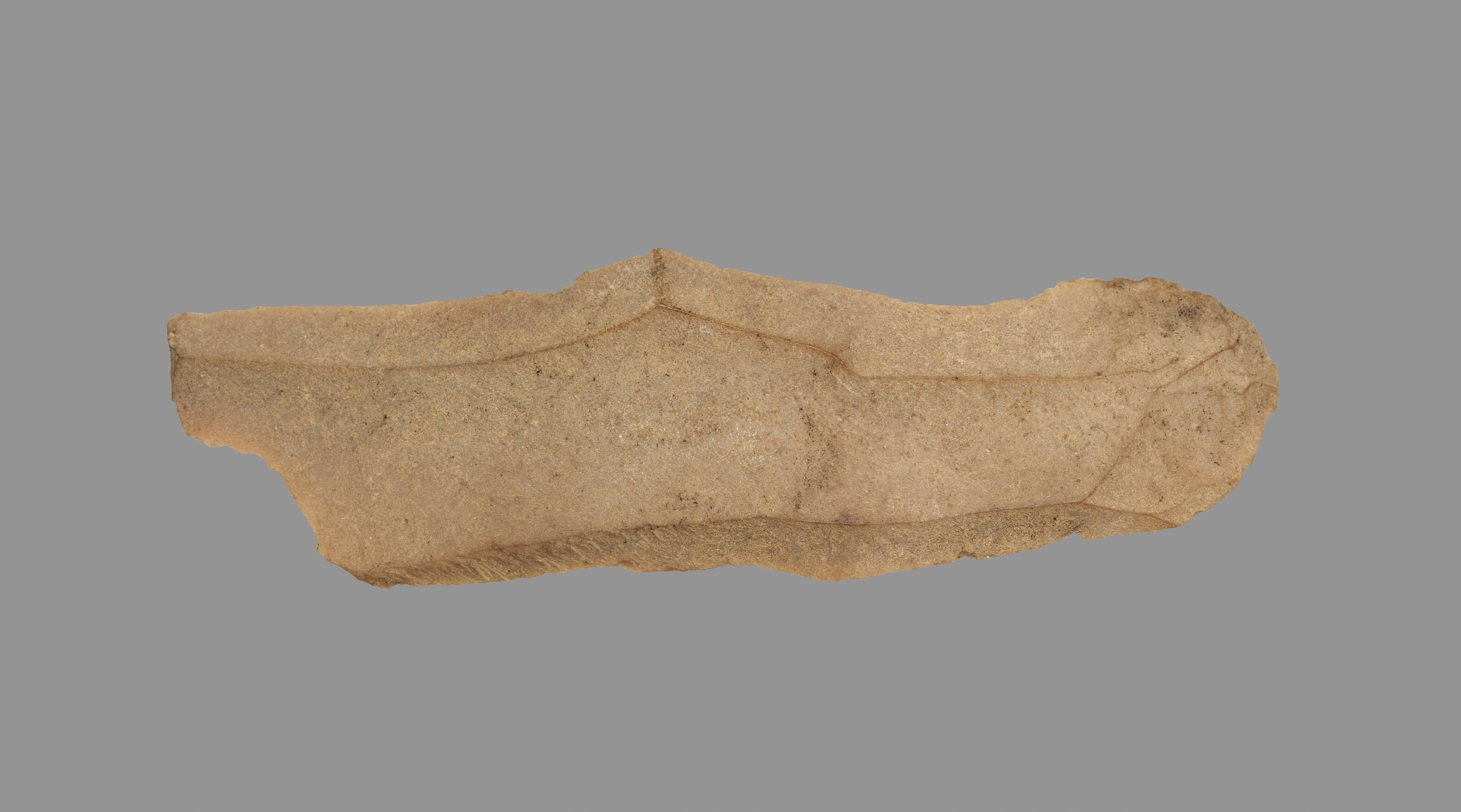 Sickle Blade by unknown artist. The image features a light-brown, stone tool with a curved edge and a straight back, resembling a sickle blade. The object has a rough texture and appears to be made of a natural material, possibly flint or obsidian. It has a pointed tip and a wavy edge along its length. The background of the image is a solid gray color. The object is positioned horizontally in the center of the image.