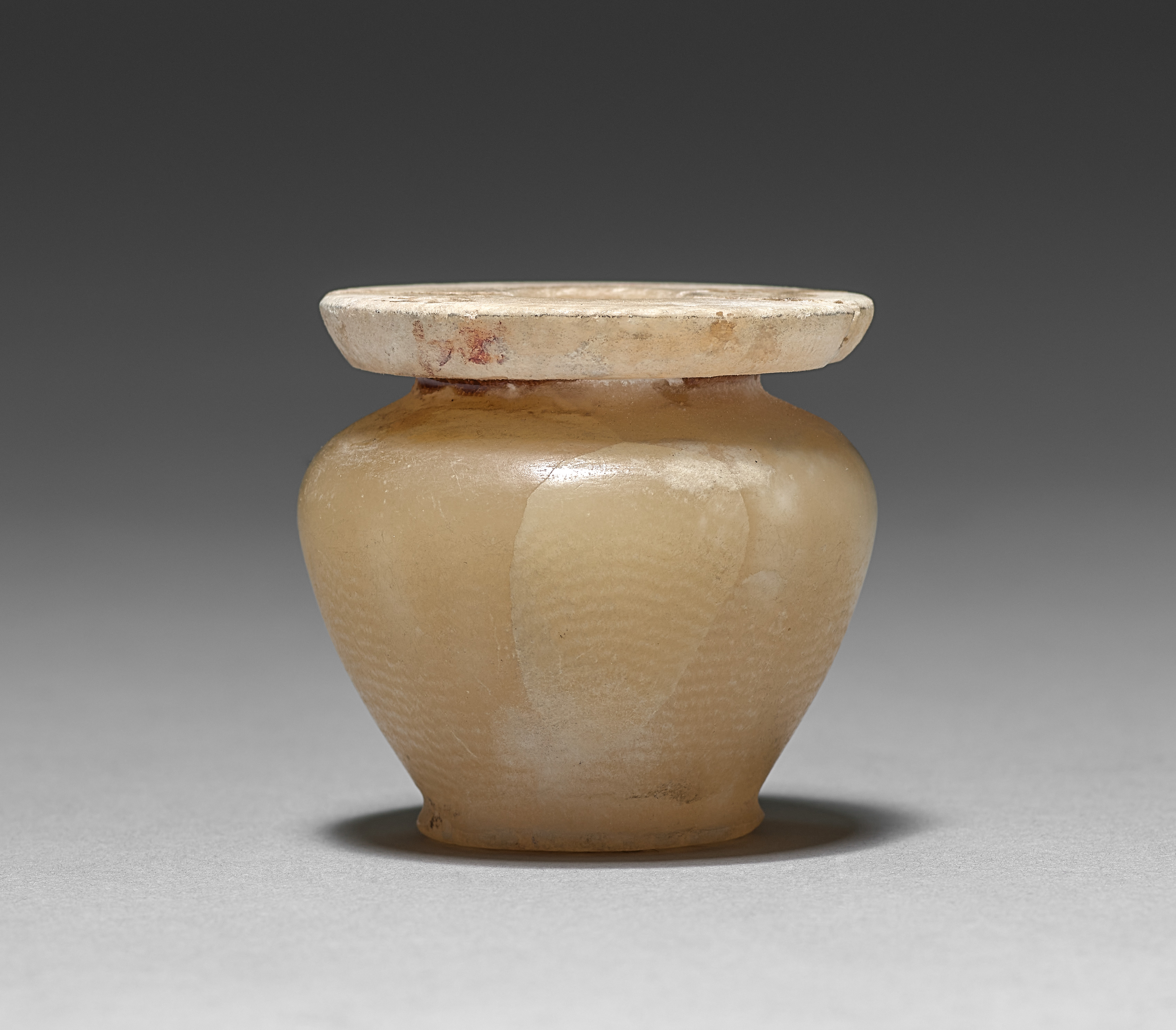 Kohl Jar with Lid, by The Metropolitan Museum of Art, is a small, beige-colored jar with a rounded body and a short neck. The jar has a wide mouth and a flat, circular lid that is slightly darker in color than the rest of the jar. The lid is made of a similar material and has a rough texture on its top surface. The jar appears to be made of stone or ceramic and has a glossy finish. It sits on a flat surface, casting a small shadow underneath. The background is a gradient of dark gray to light gray. The jar has a small foot at its base. The overall shape of the jar is bulbous.