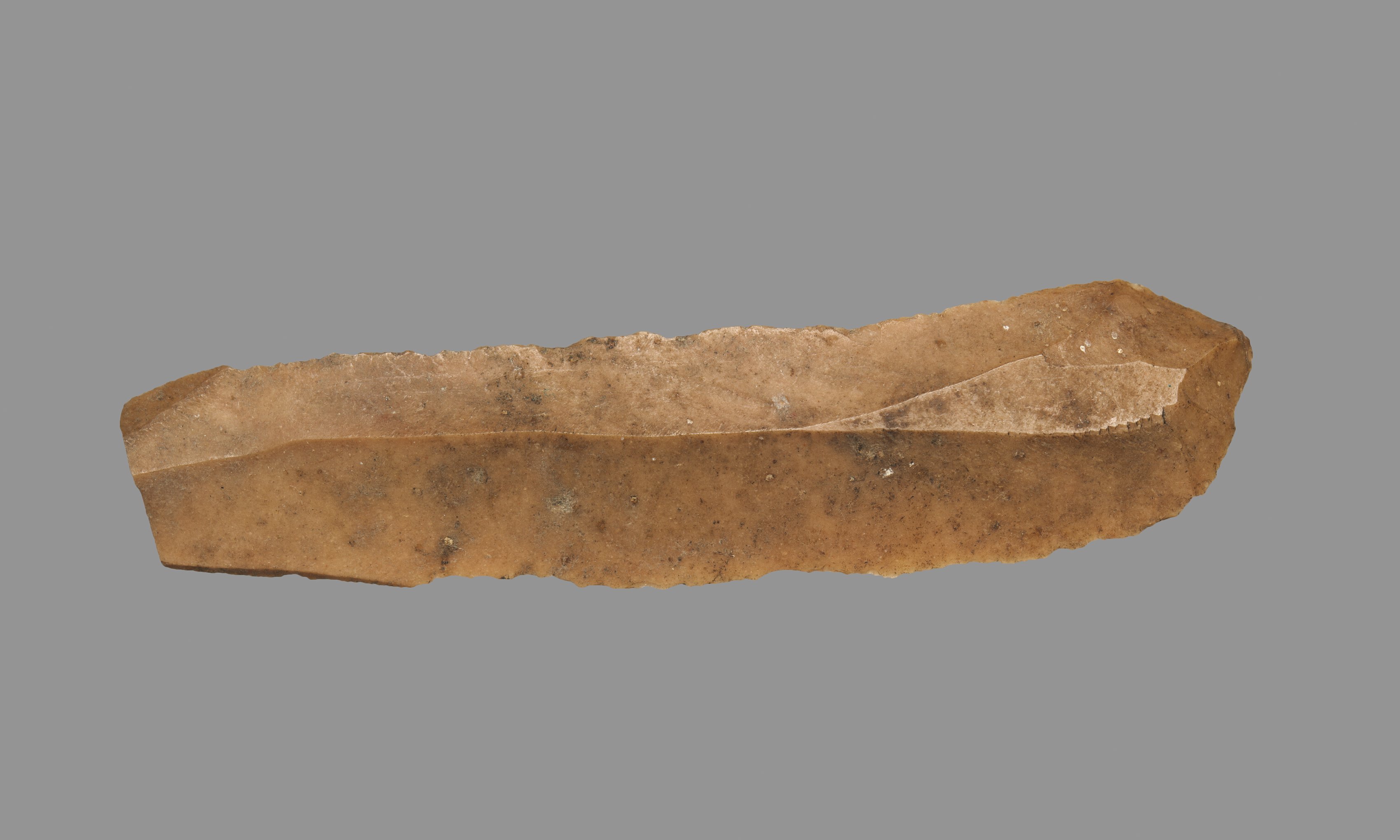 The Sickle Blade by unknown artist: a long, thin, light brown stone tool with a curved edge and a straight edge, featuring a pointed tip and a rough texture. The tool has darker brown and black spots on its surface and a flat, smooth face. The background is gray.