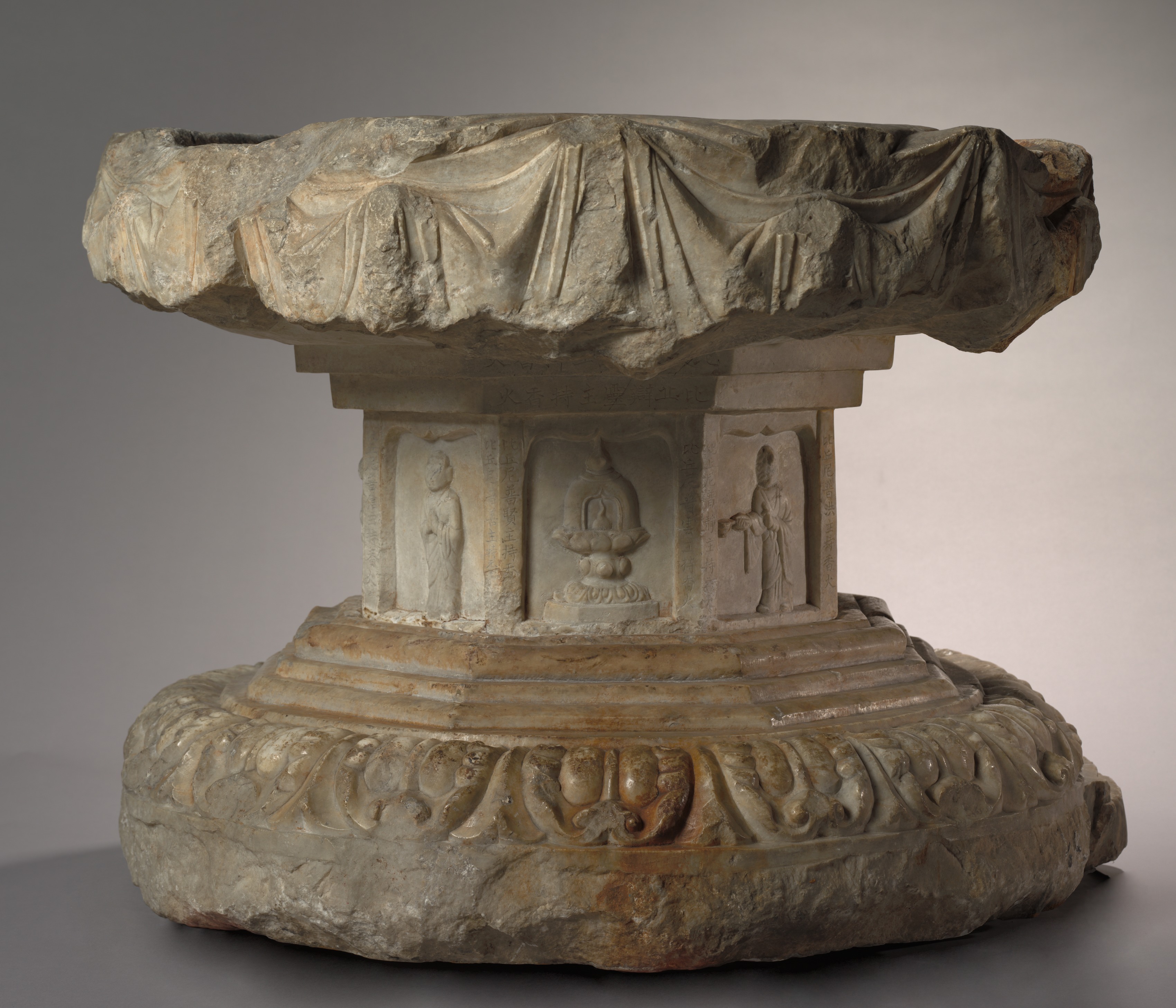 The Fang Xuanling Pedestal by an unknown artist is a stone pedestal with a wide, flat top and a carved base. The top has a rough edge and appears to be draped with fabric carved into it. The base is round and has a carved design around it. The pedestal is made of stone and has a weathered appearance. It has three carved panels on the front, each depicting a different figure or object. The left panel shows a standing figure, the middle panel shows a seated figure, and the right panel shows another standing figure. The background of the image is a gradient of gray and white. The pedestal sits on a dark surface, with a shadow cast behind it.