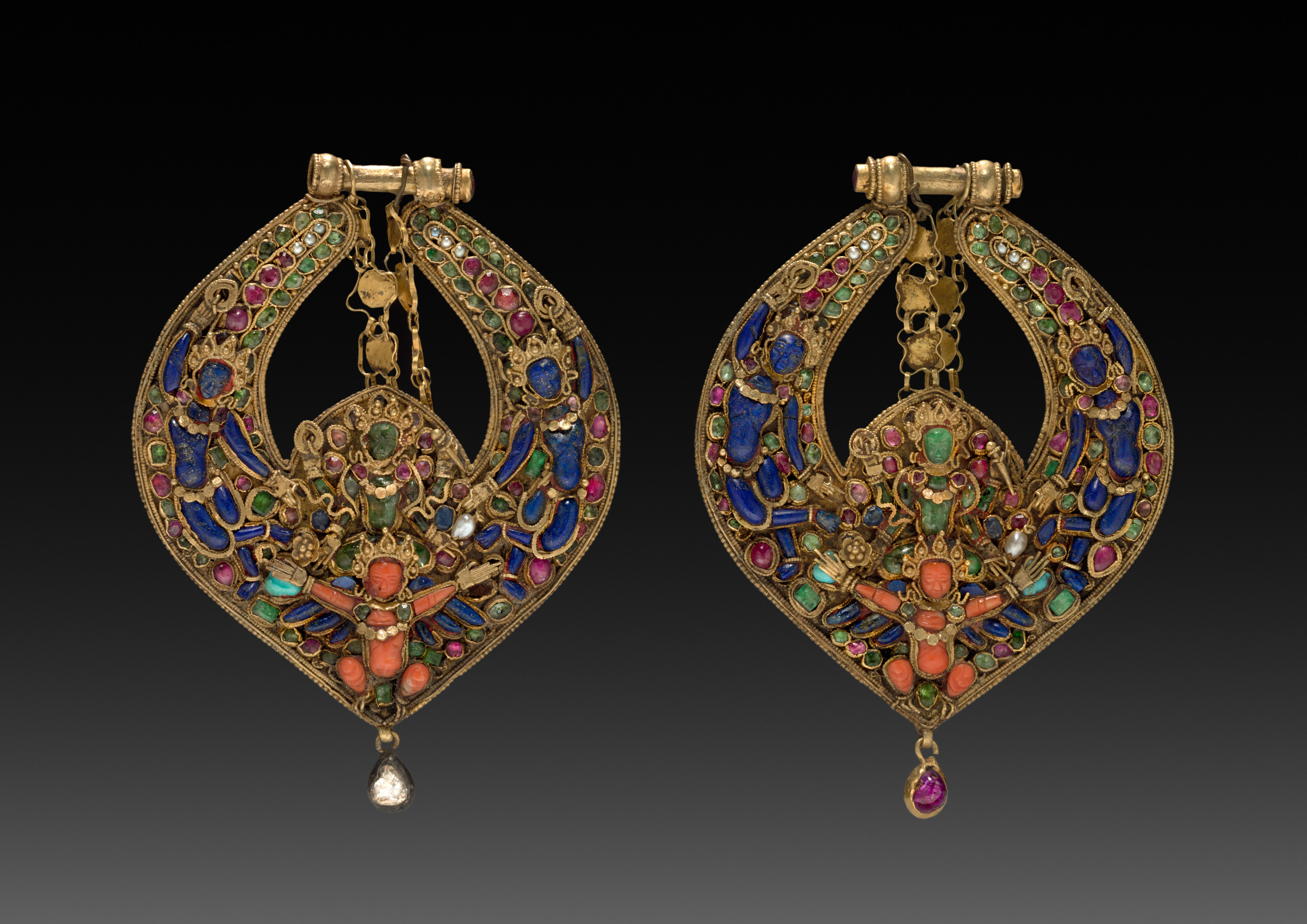 Pair of gold earrings with a teardrop shape, having a smaller teardrop-shaped component inside a larger one. The earrings are decorated with various gemstones including blue lapis lazuli, pink rubies, green emeralds, and white diamonds. A figure of Vishnu on Garuda is on one side and a Chepu monster mask on the other. The earrings have a gold post at the top and a dangling gemstone at the bottom. The background is black, which helps to highlight the vibrant colors of the gemstones. The earrings are symmetrical, with identical designs on both sides but with Vishnu on Garuda on one earring and Chepu on the other.