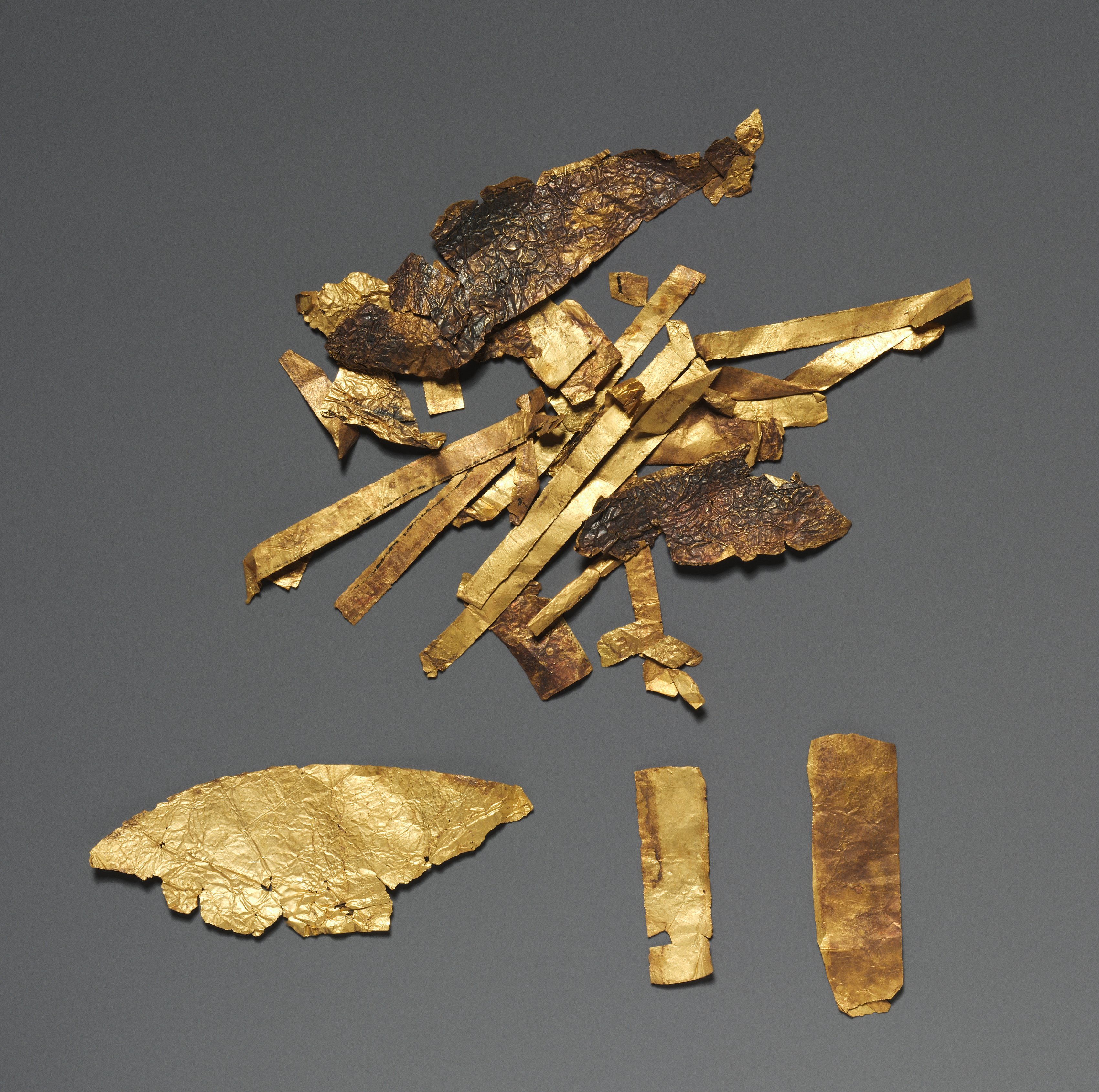 Fragments of Decoration from Funerary Equipment by Unknown. The image shows a collection of gold fragments. The fragments are various shapes and sizes. Some are long and thin strips, while others are irregularly shaped. The gold color ranges from shiny to dark brown and black in some areas. The shiny areas reflect light and appear to be made of a thin, metallic material. The background is a solid dark gray color. There are five pieces of gold leaf or foil at the bottom of the image, separated from the rest. The overall appearance suggests that the fragments are old and possibly from an archaeological site.