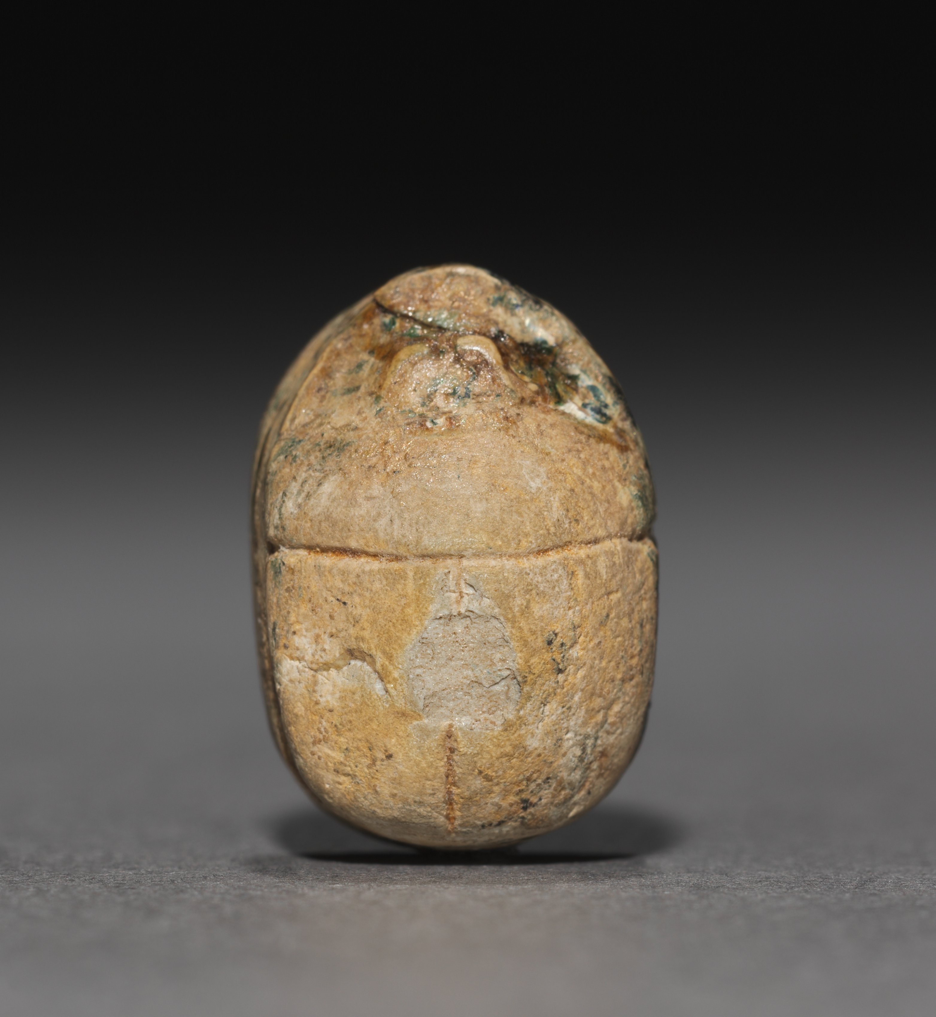 Tan and brown stone object, resembling a scarab beetle, appears to be made of stone or ceramic, with a rounded top and flat bottom. The object is egg-shaped, with a horizontal line separating the top and bottom halves. The top half features a small, raised detail on the right side, while the bottom half has a raised symbol. The object exhibits a rough texture and is predominantly tan with brown and green undertones. The background transitions from dark gray at the top to light gray at the bottom. Scarab by artist unknown.