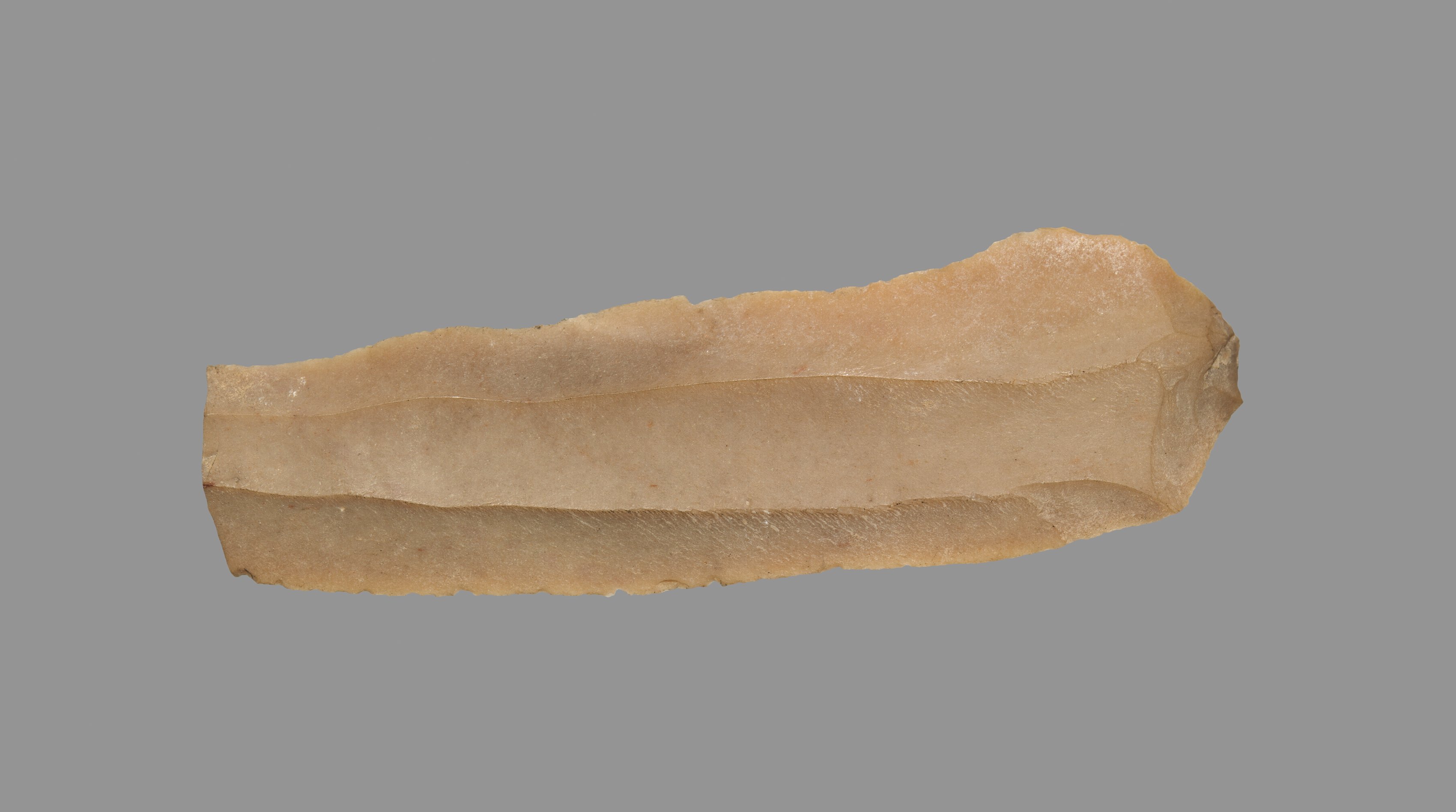 The image shows a light brown, elongated stone tool with a flat, curved blade and a rough edge. The tool is made of a light brown stone, possibly flint or chert, with visible striations and a smooth surface. The blade is curved with a rounded tip on the right and a more jagged edge on the left. The tool has a flat, wide shape with a straight edge on the bottom and a more uneven edge on top. The background of the image is a solid gray color. The artist of this piece is unknown, but the title is "Sickle Blade".
