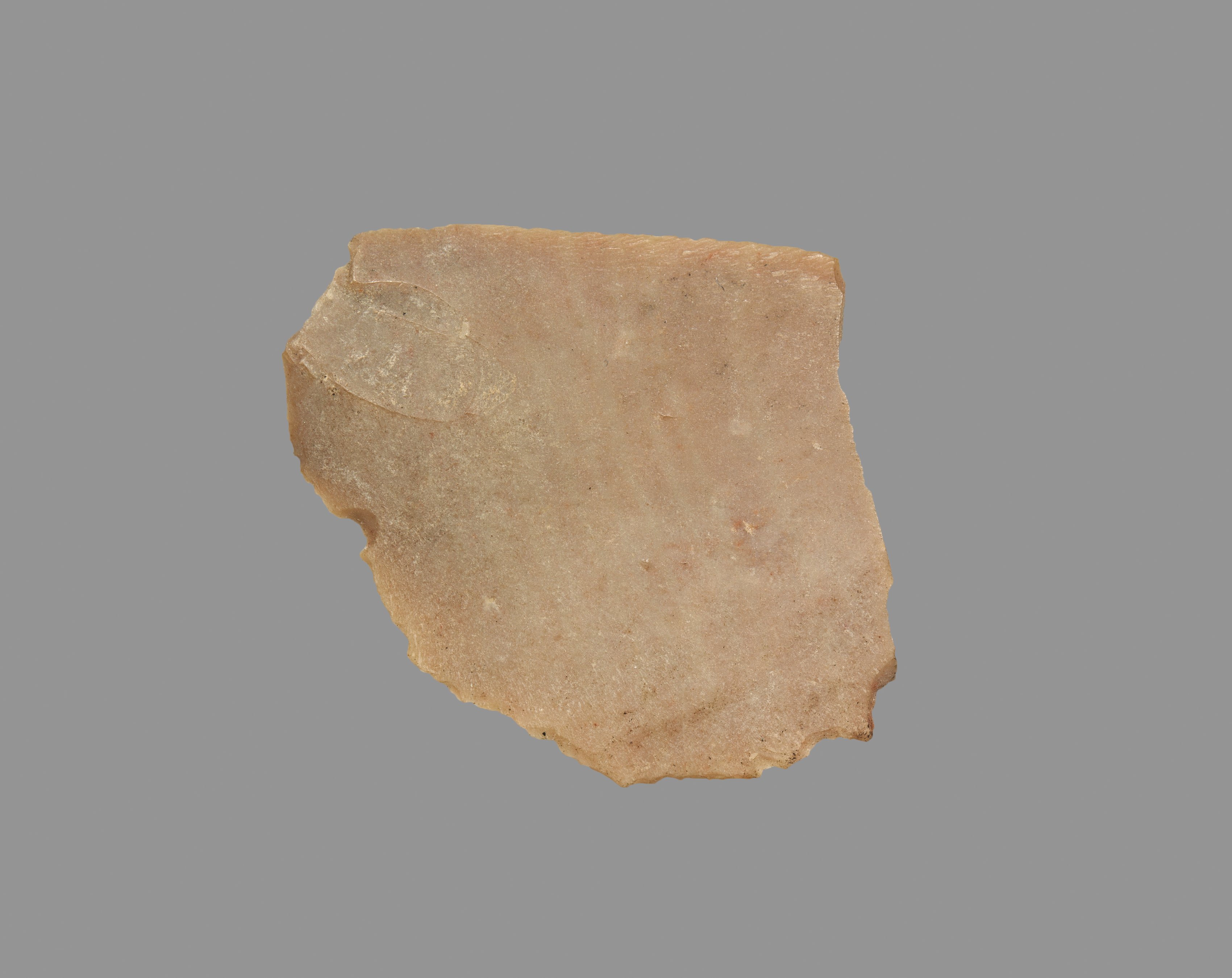 The piece of stone tool, titled "Sickle Blade" by an unknown artist, is irregularly shaped with jagged edges. The color is a light brown or beige hue, with a smooth surface and visible signs of wear. The object appears to be a fragment, with one side having a more rounded edge and the other side being more jagged. The background of the image is a solid gray color.