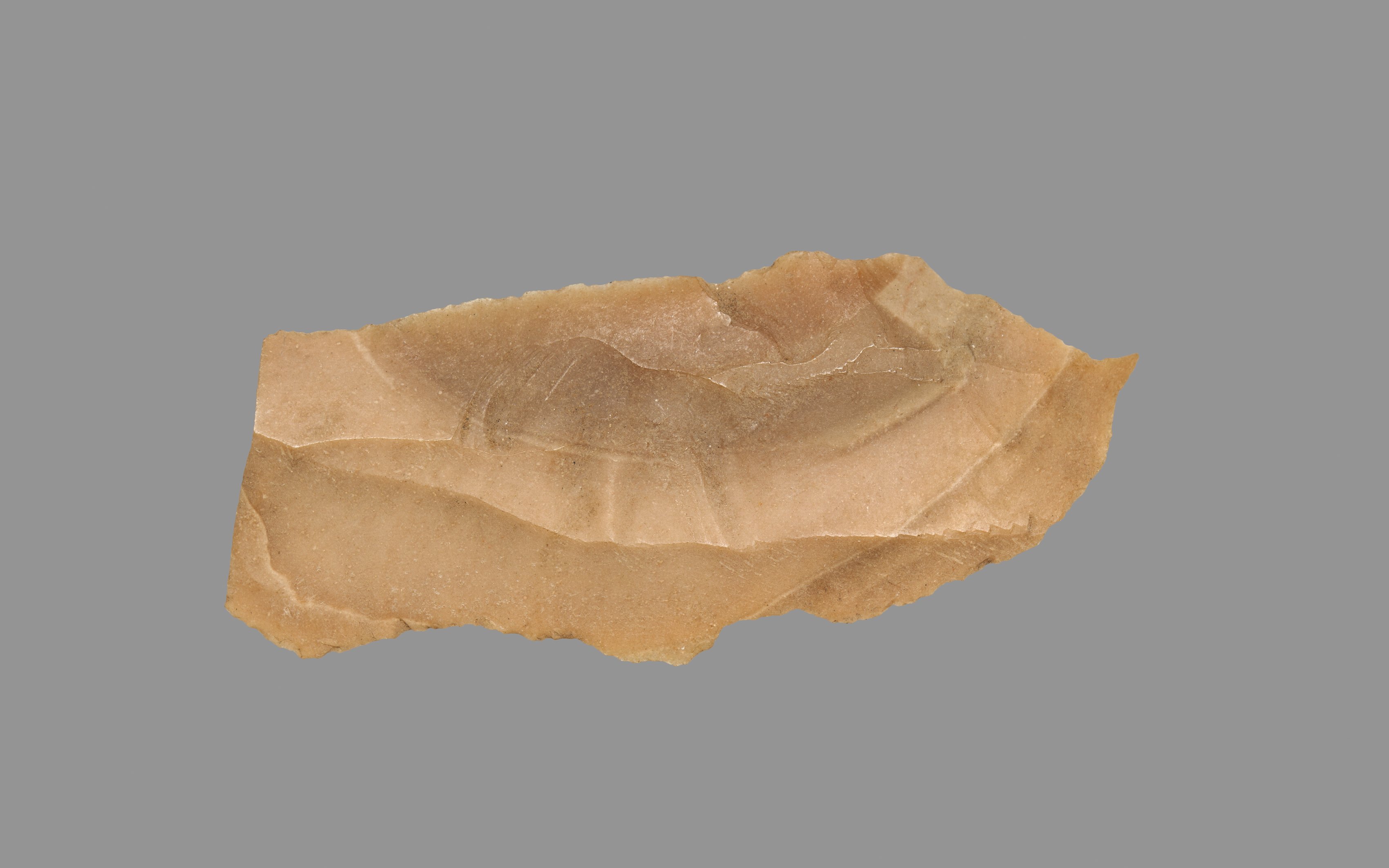 The image shows a stone tool with a curved, elongated shape and a rough edge. The tool is light brown in color with darker brown areas. It has a wavy edge and appears to be made of flint or similar material. The background of the image is gray. The title of the image is "Sickle Blade".
