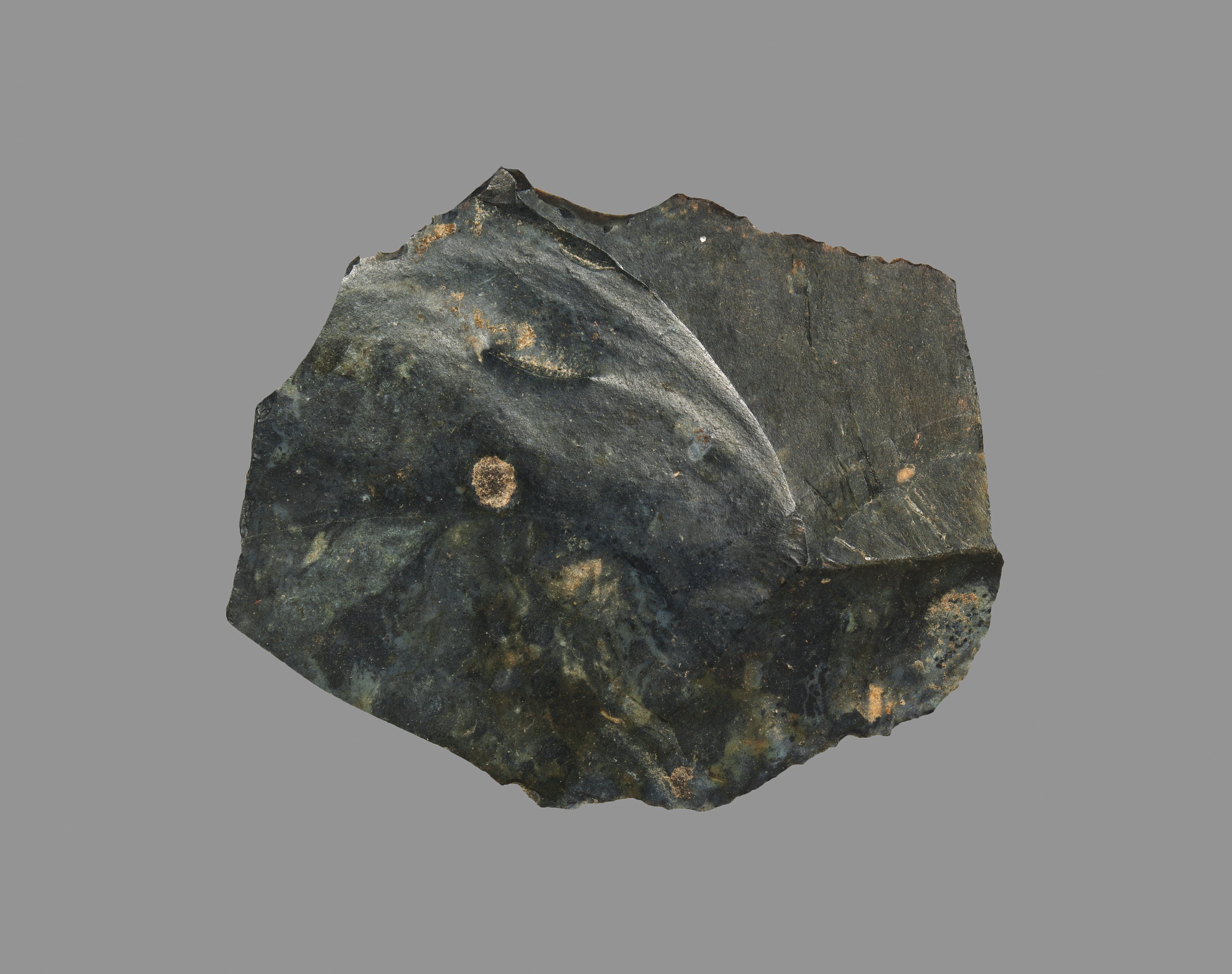 Dark gray stone tool with a curved edge, resembling a sickle blade. The tool has a rough, jagged appearance with a slightly serrated edge and a small circular imperfection on its surface. The stone is predominantly dark gray with flecks of lighter gray and brown throughout. The background is a solid gray color. The image features the Sickle Blade by an unknown artist.