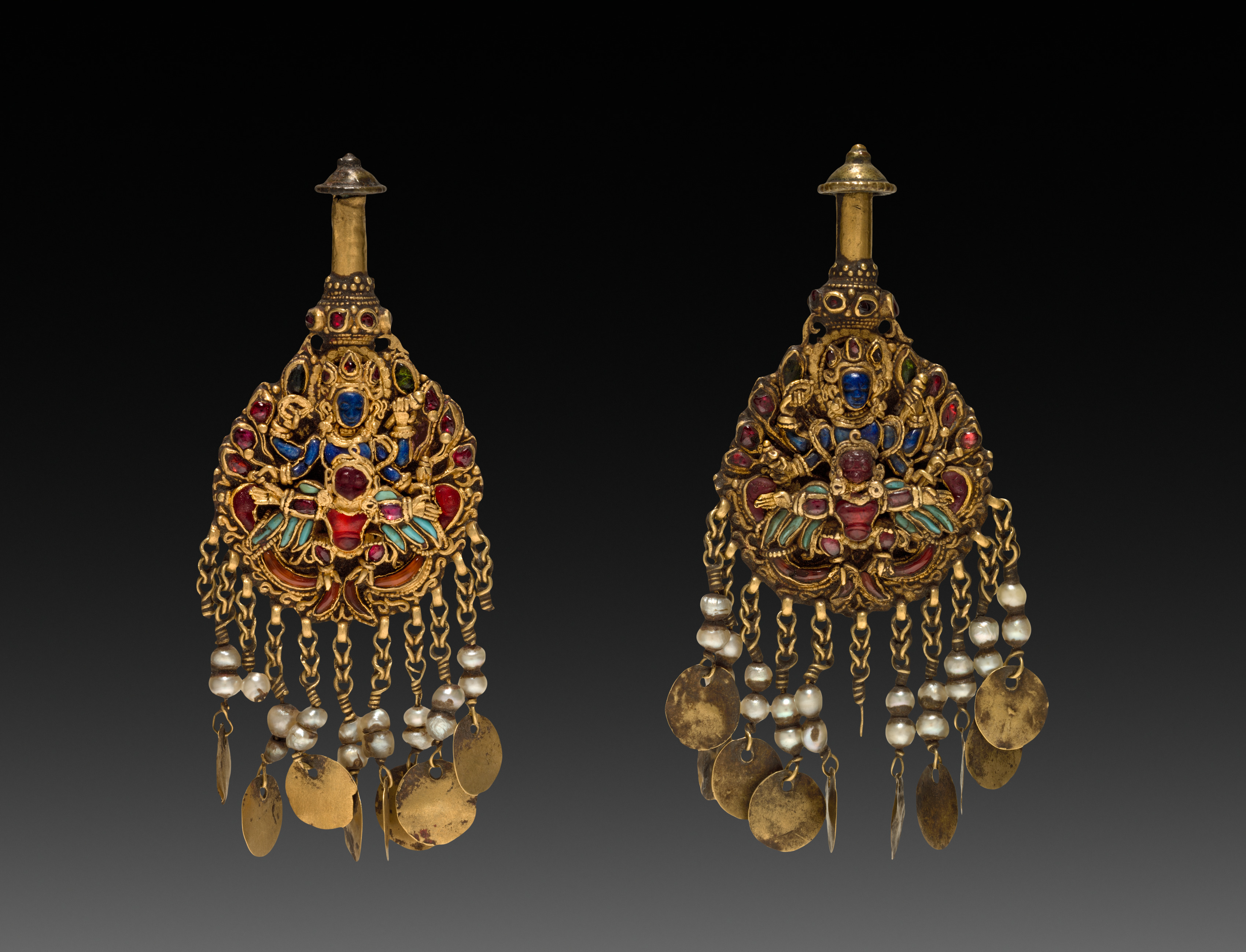 Pair of Deity Earrings with Vishnu on Garuda (front) and chepu (monster mask) (back)