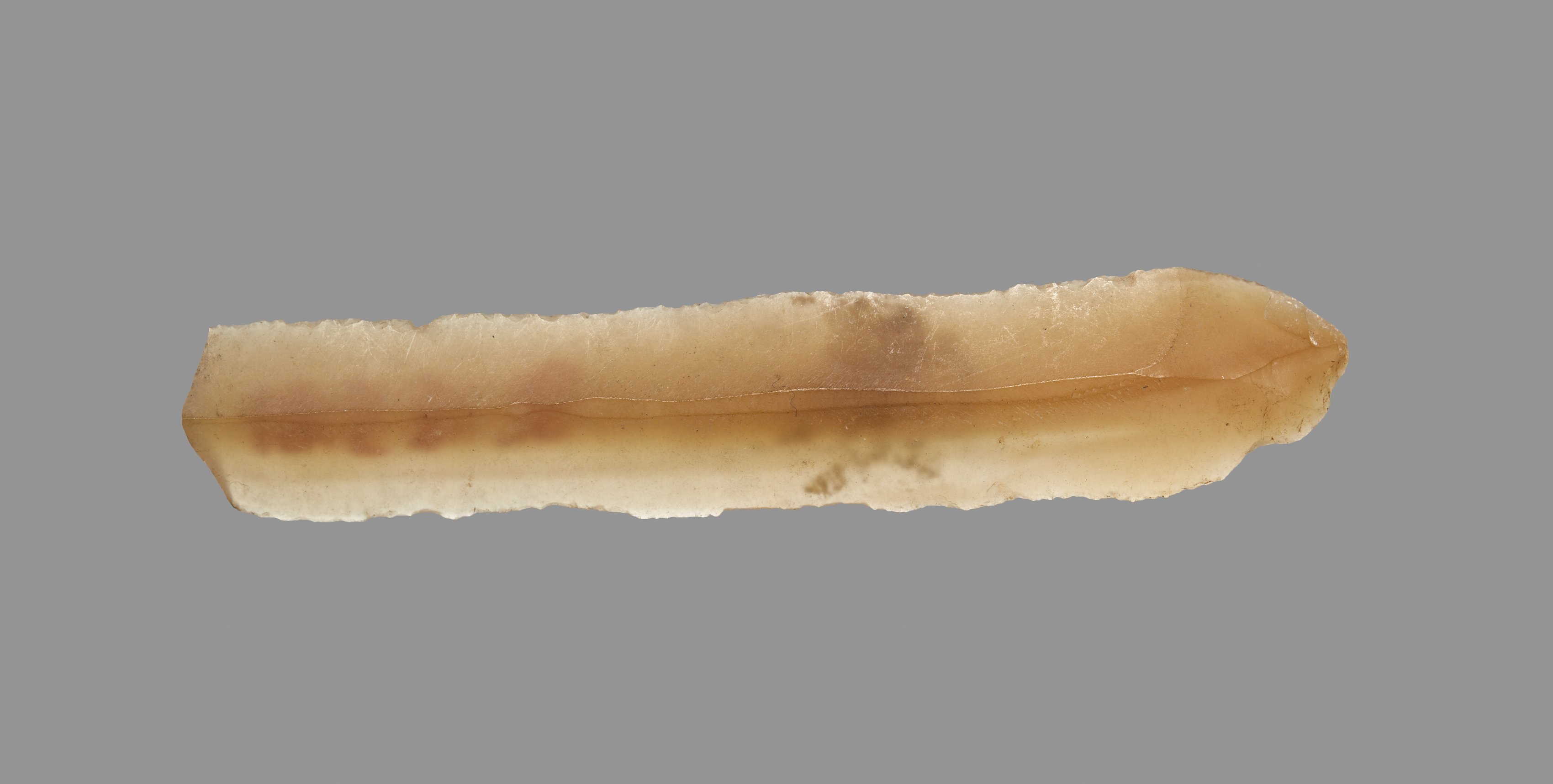 The Sickle Blade by an unknown artist is a long and thin object with rough edges. The object features a light-brown coloration on the top third with the remainder of the object being white. The object has a straight, smooth edge on the bottom and a jagged edge on the top. The background is gray.