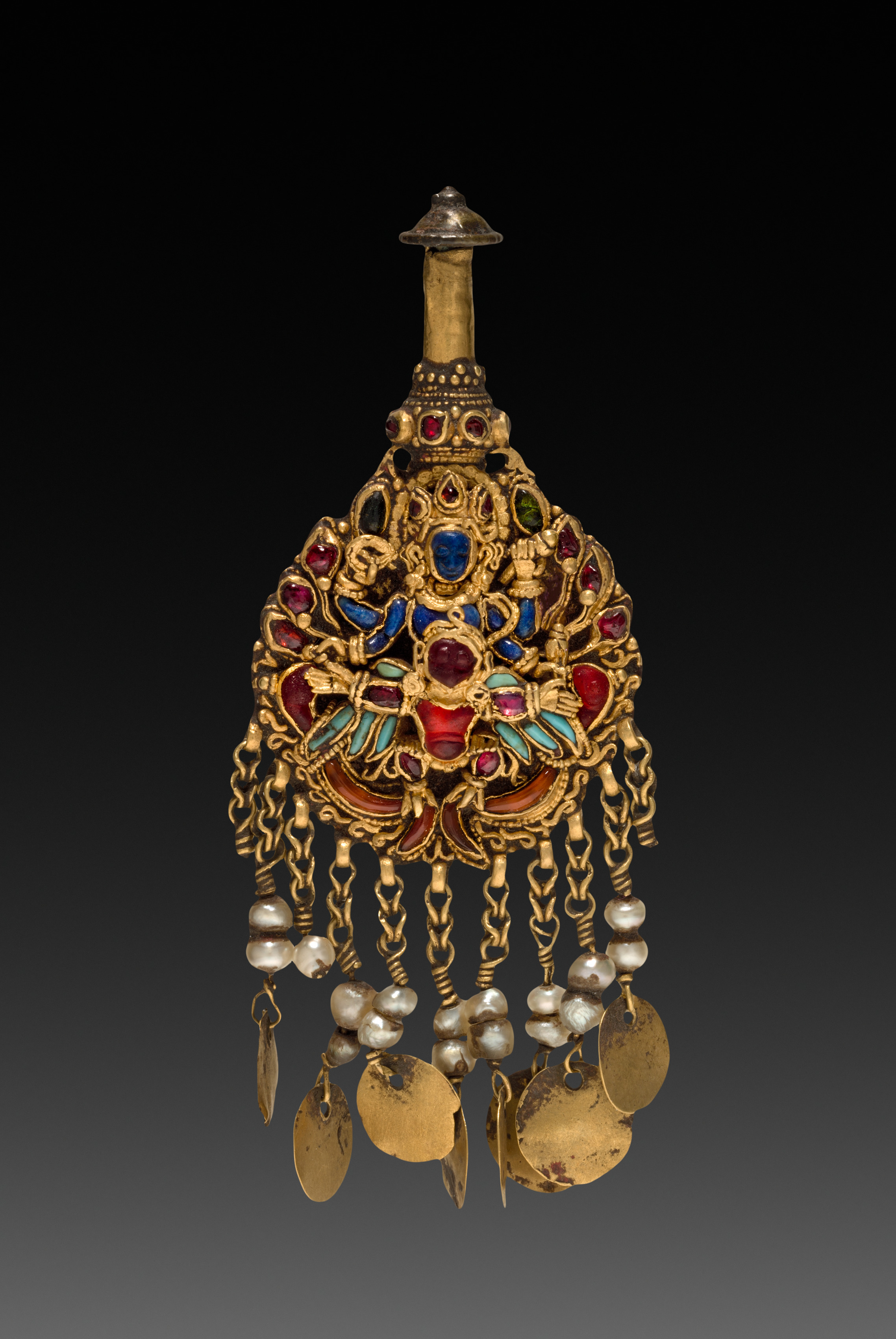 Gold earring with a figure of Vishnu riding Garuda. The earring is shaped like a dome with a post at the top. The dome is decorated with red, blue, green, and turquoise stones. There are several rows of gold chains and pearls hanging from the bottom of the earring. Small gold discs are also hanging from the bottom. The background of the image is black, with a gradient that gets lighter towards the bottom.