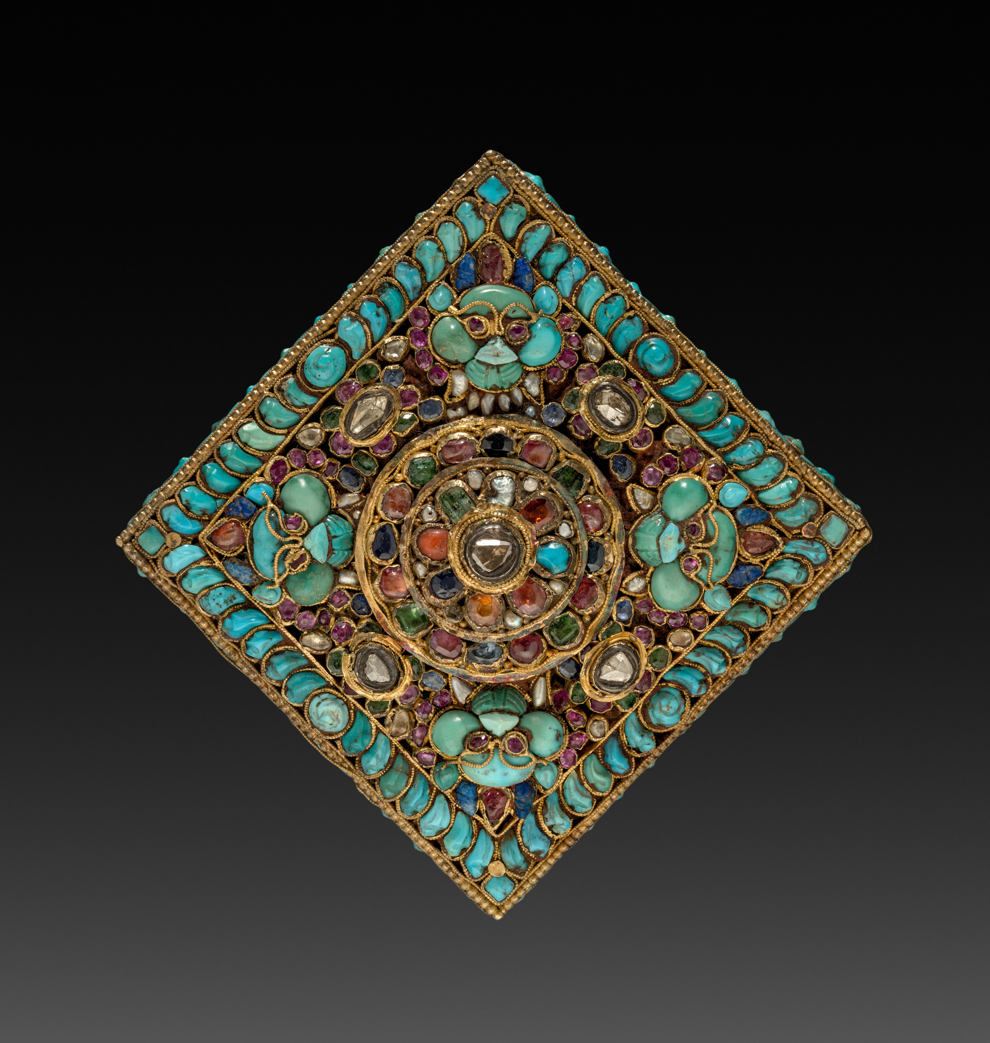 Square-shaped object with a gold-colored metal frame. The object has a diamond shape formed by its corners pointing to the top, bottom, left, and right. The object features a spiral or circular design in the center. The center spiral design has a clear stone in the middle. The object is adorned with various colored stones, including turquoise, rubies, and other gemstones. The stones are arranged in a pattern around the center spiral design. The object has a beaded border around its edges. The background of the image is black, with a gradient that lightens towards the bottom. The object titled "Charm Case" and created by an artist.