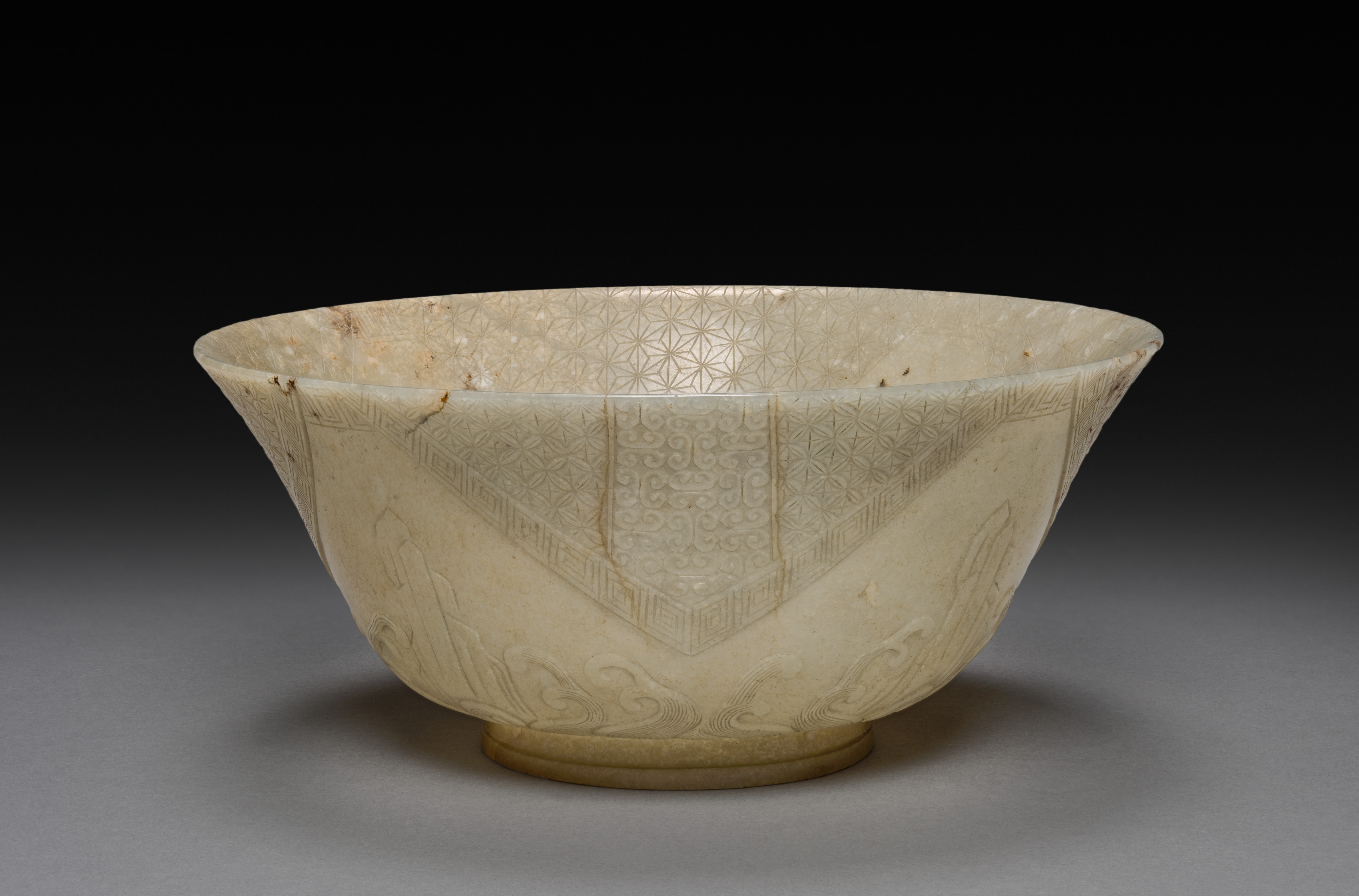 The bowl is a cream-colored, ceramic vessel. It has a wide mouth and a narrow base. The bowl is decorated with etched designs. The etchings are geometric patterns and appear to be symmetrical. The bowl has a small foot at the bottom. The background is black at the top and fades to gray at the bottom. The bowl's title is "Bowl".