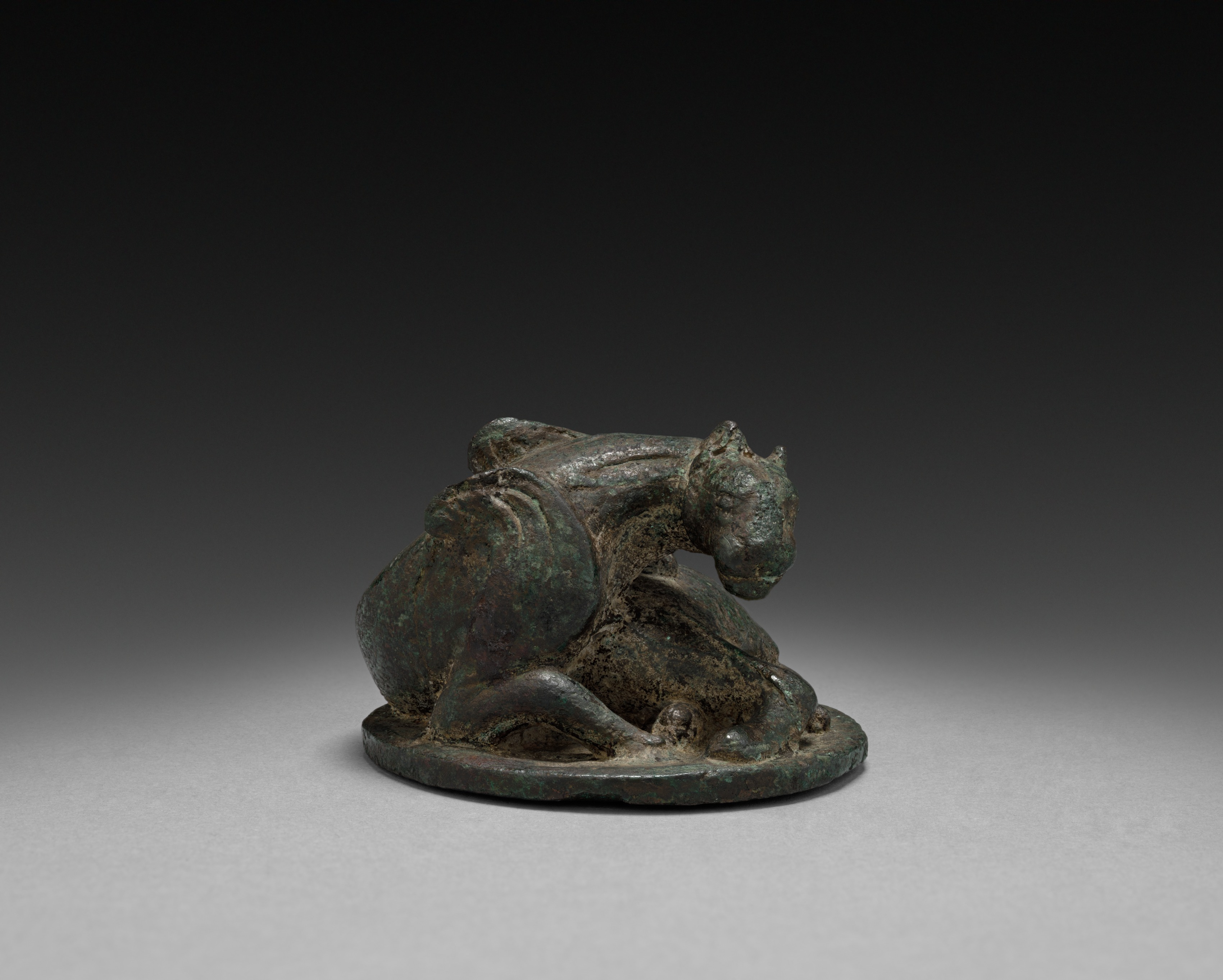 Weight in the form of a coiled animal by Unknown. The image shows a small, dark green, bronze or copper sculpture of an animal. The animal is curled up in a sitting position with its head facing to the right. The sculpture sits on a flat round base. The animal appears to have a smooth body with a round swelling on its back. The head and body are joined by a short neck. The animal's ears are visible on top of its head. The sculpture has a weathered appearance with visible signs of aging and wear. The background is dark gray to black, fading to light grey at the bottom. The sculpture casts a faint shadow on the surface it's sitting on.
