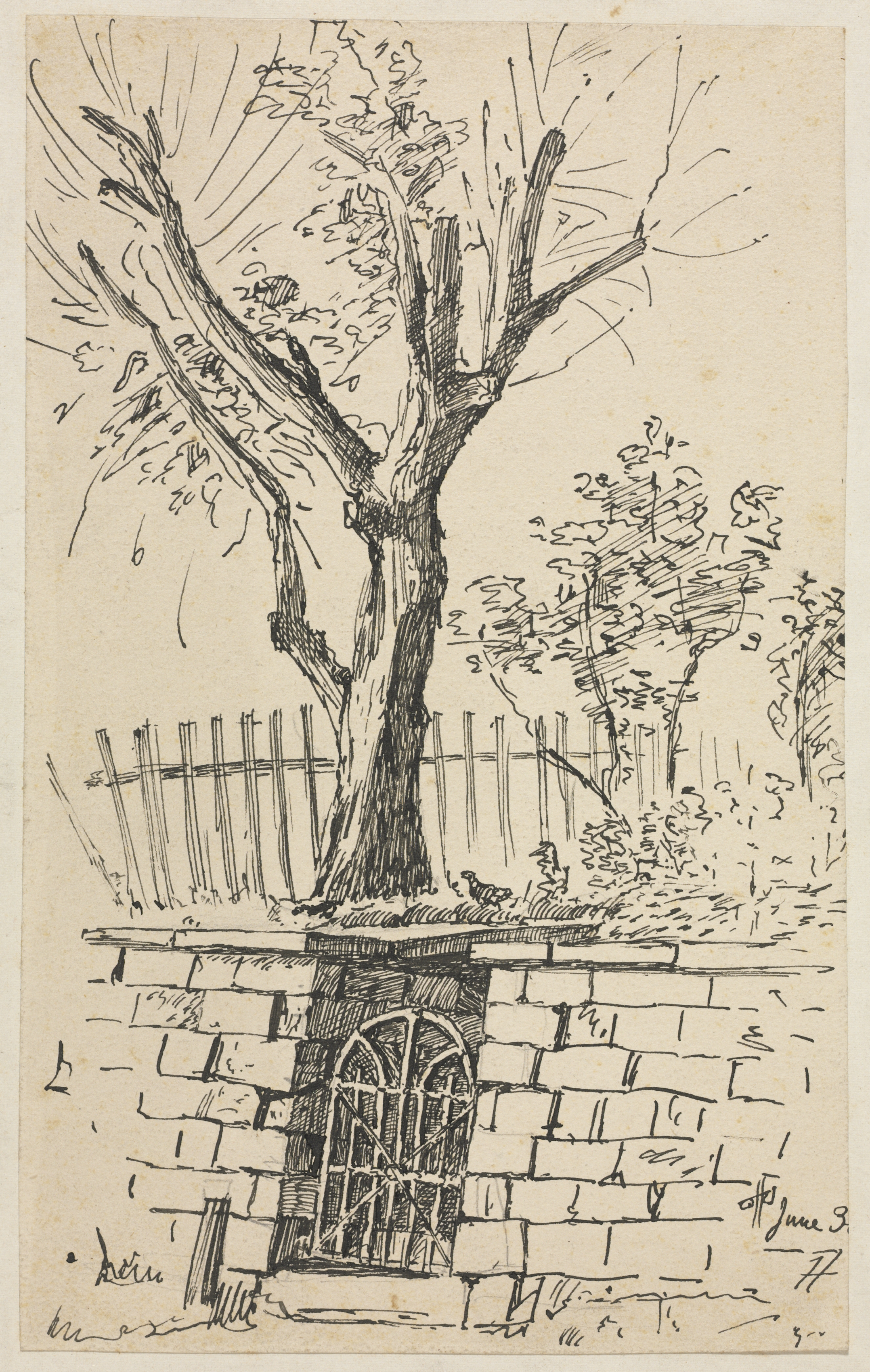 A black and white sketch on aged paper depicts a tree on top of a short stone wall with a small gate. The tree has a thick trunk and several bare branches. A short wooden fence is behind the stone wall. The tree's roots have grown over and around the stone wall. A small gate with an arched top is built into the wall. The wall is made of rectangular stones of varying sizes. The background includes more trees. The artist's signature is in the bottom-right corner.