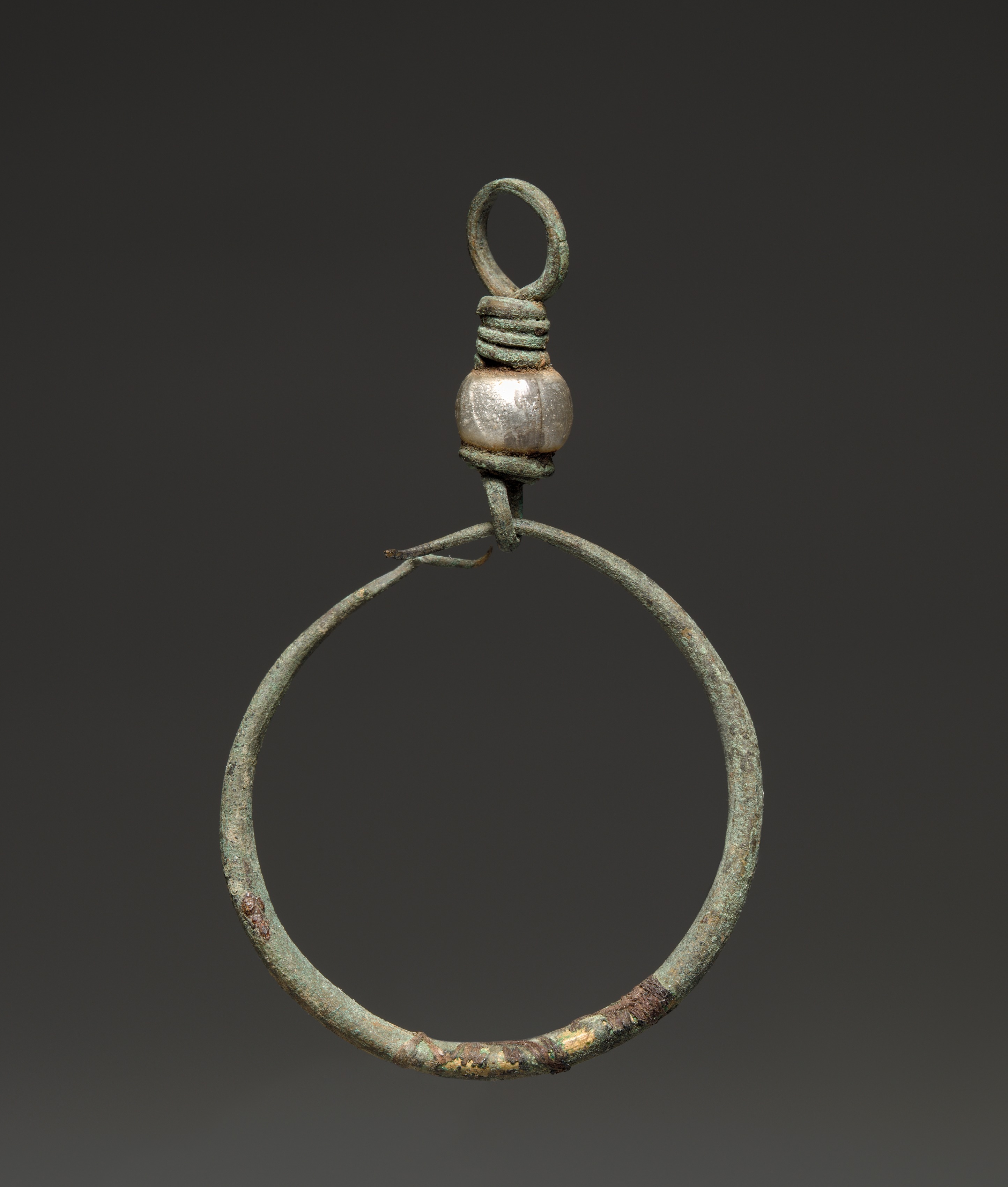 The Earring by Unknown Artist shows a large, circular earring made of a single piece of metal wire with a loop at the top. The earring's wire body appears to be made from a weathered, greenish metal. A silver-colored bead is attached to the top of the earring. The background of the image fades to dark gray.