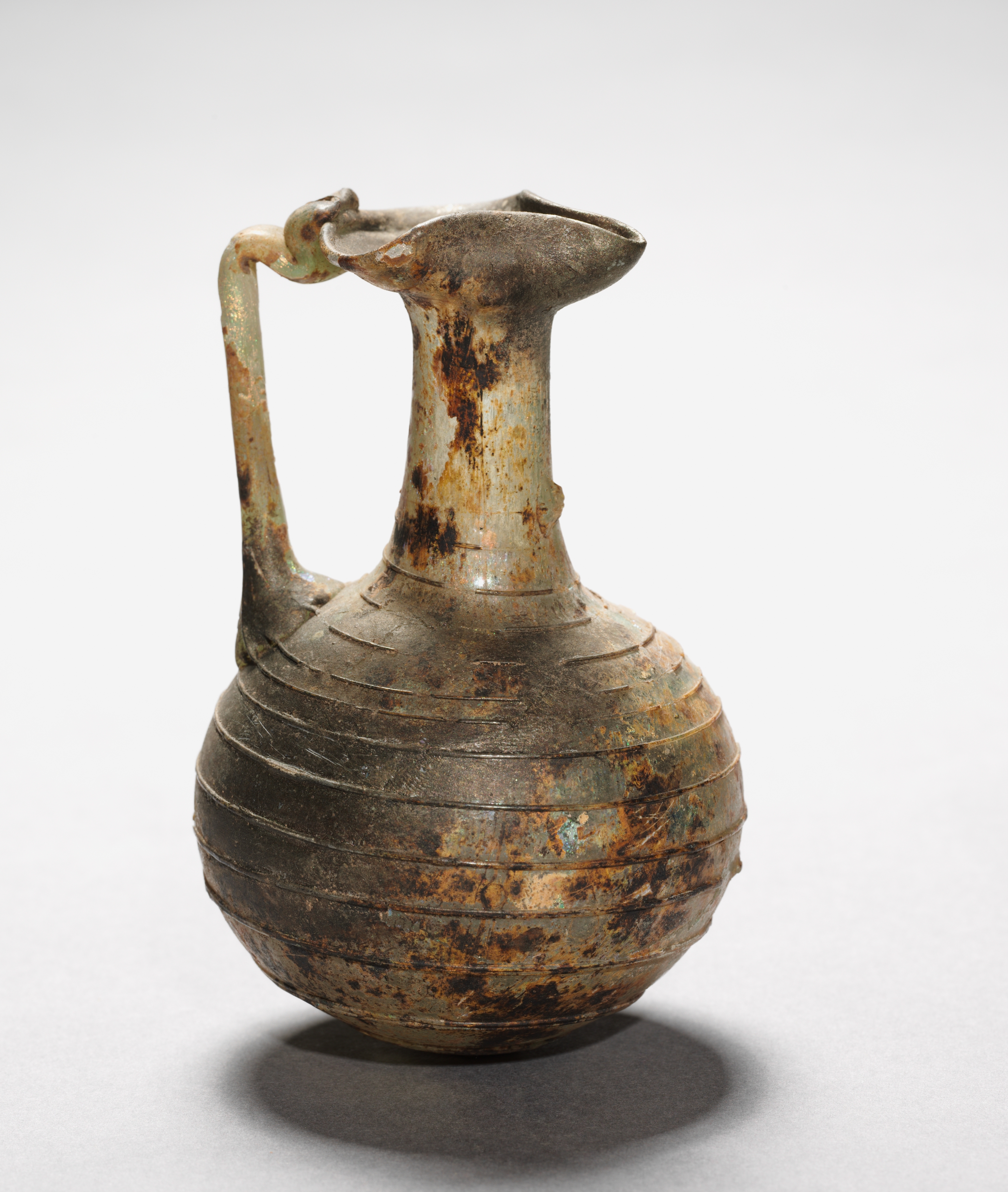 The Pitcher with Handle by Unknown Artist. The object is a ceramic or metal jug with a rounded body, featuring horizontal grooves around its circumference. The jug's base is rounded and it tapers up to a narrower neck, then flares out at the top. A handle extends from the side of the body to the top, where it connects near the lip. The object has a predominantly brown color with patches of green and visible signs of wear and aging, including rust spots and discoloration. The background is plain white, with a shadow cast by the object.