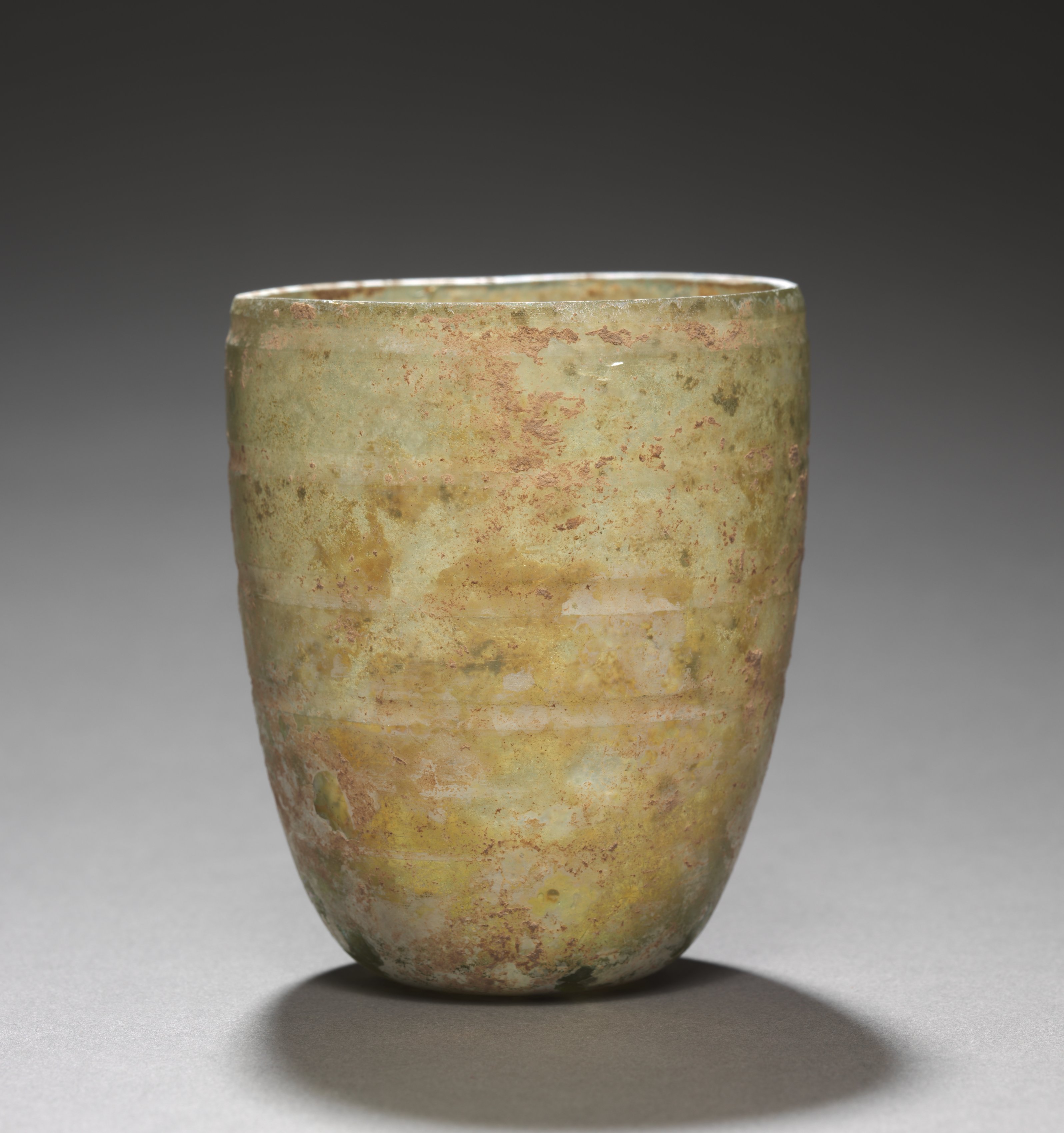 The image shows a ceramic cup by artist Bernard Leach. The cup is made of ceramic and has a cylindrical shape. The cup is wider at the top than at the bottom. The cup has a light greenish-beige color with brown and yellow speckles and patches. The cup has a glossy glaze that reflects light. The cup has three horizontal lines on its body, evenly spaced. The background of the image is dark gray at the top and light gray at the bottom. The cup casts a shadow on the surface below it. The surface the cup is sitting on is light gray.