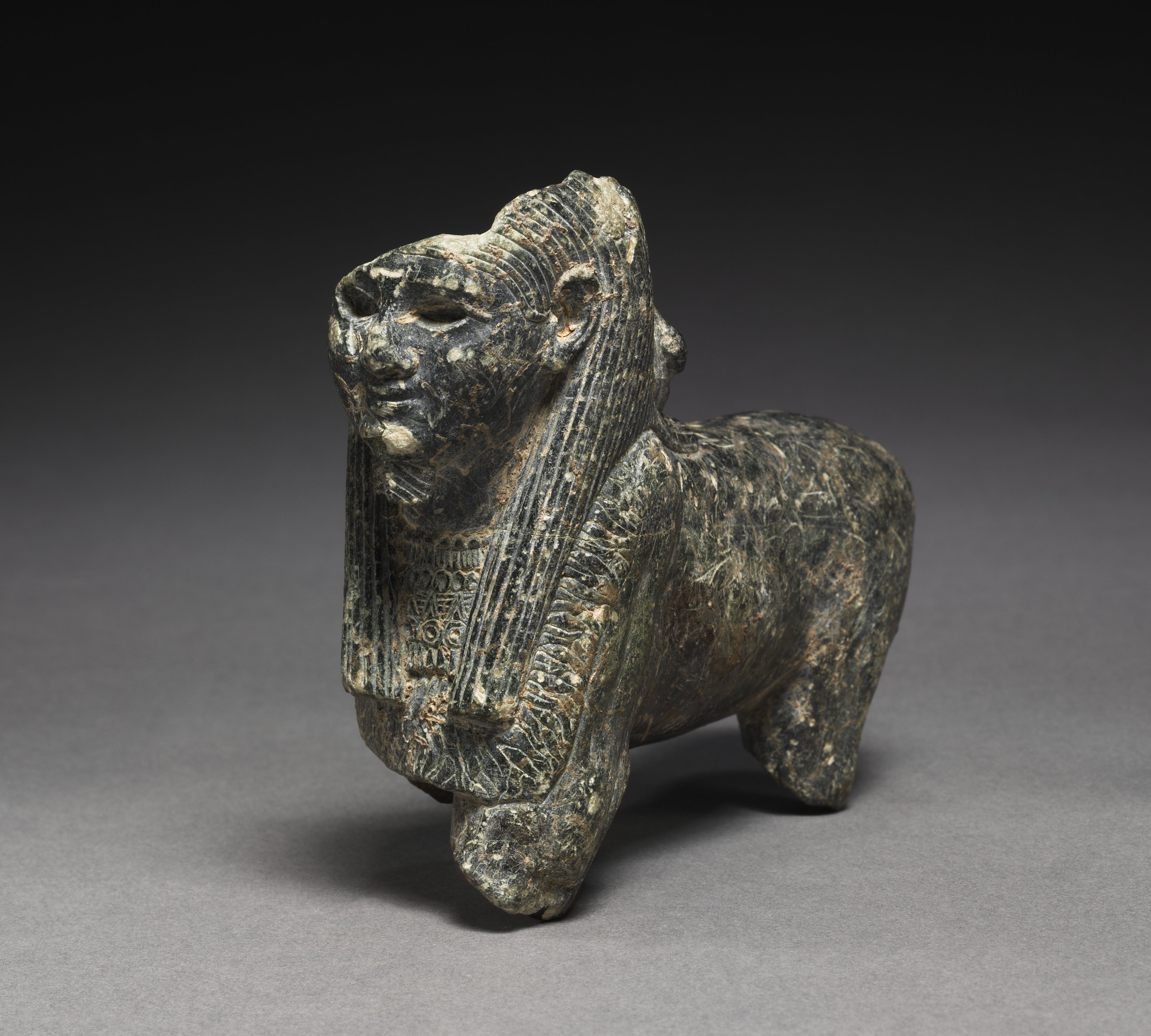 The sculpture depicts a creature with a humanoid head and a lion-like body, titled "Tutu as Sphinx". The sculpture is dark gray with lighter gray and beige patches. It has a humanoid head with a long nose and chin, and a mouth that is slightly open, revealing the top of the mouth and the bottom row of teeth. The eyes are two small holes. The body is that of a lion, with four legs, and the front right leg is slightly raised. The sculpture has a long neck and a mane that runs down the back of the neck and along the front of the chest. The mane is decorated with vertical lines and geometric patterns. The background is a gradient from dark gray at the top to light gray at the bottom. The sculpture appears to be made of stone or metal.