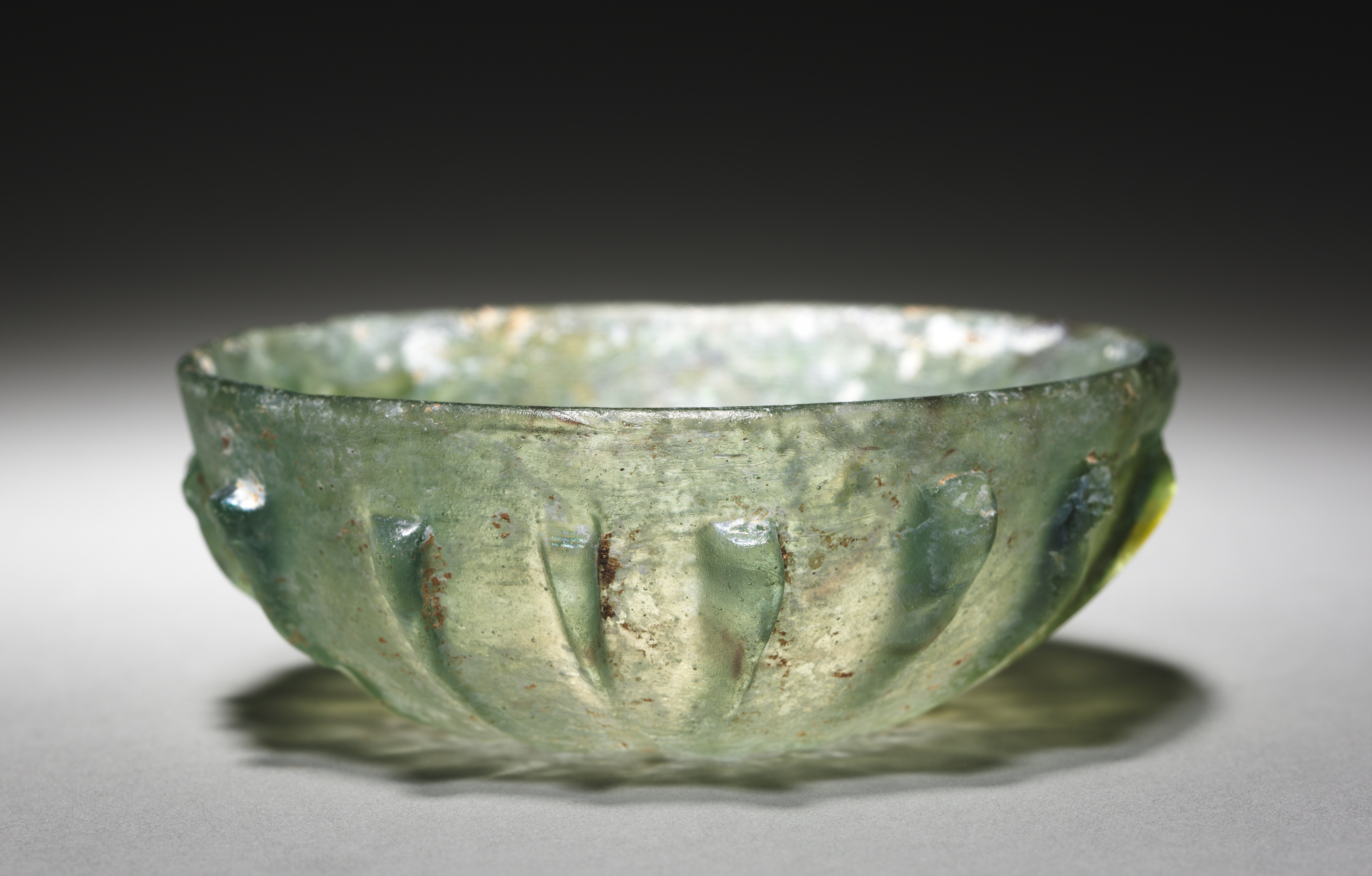 Green glass bowl with a ribbed exterior and a rounded shape. The bowl has a wide mouth and a narrow base. It is semi-transparent. The exterior has vertical ribs. The glass appears weathered with brown specks and a rough texture. The background is gray with a black vignette effect. The bowl casts a shadow on the surface below. The title of the piece is "Shallow Ribbed Bowl".