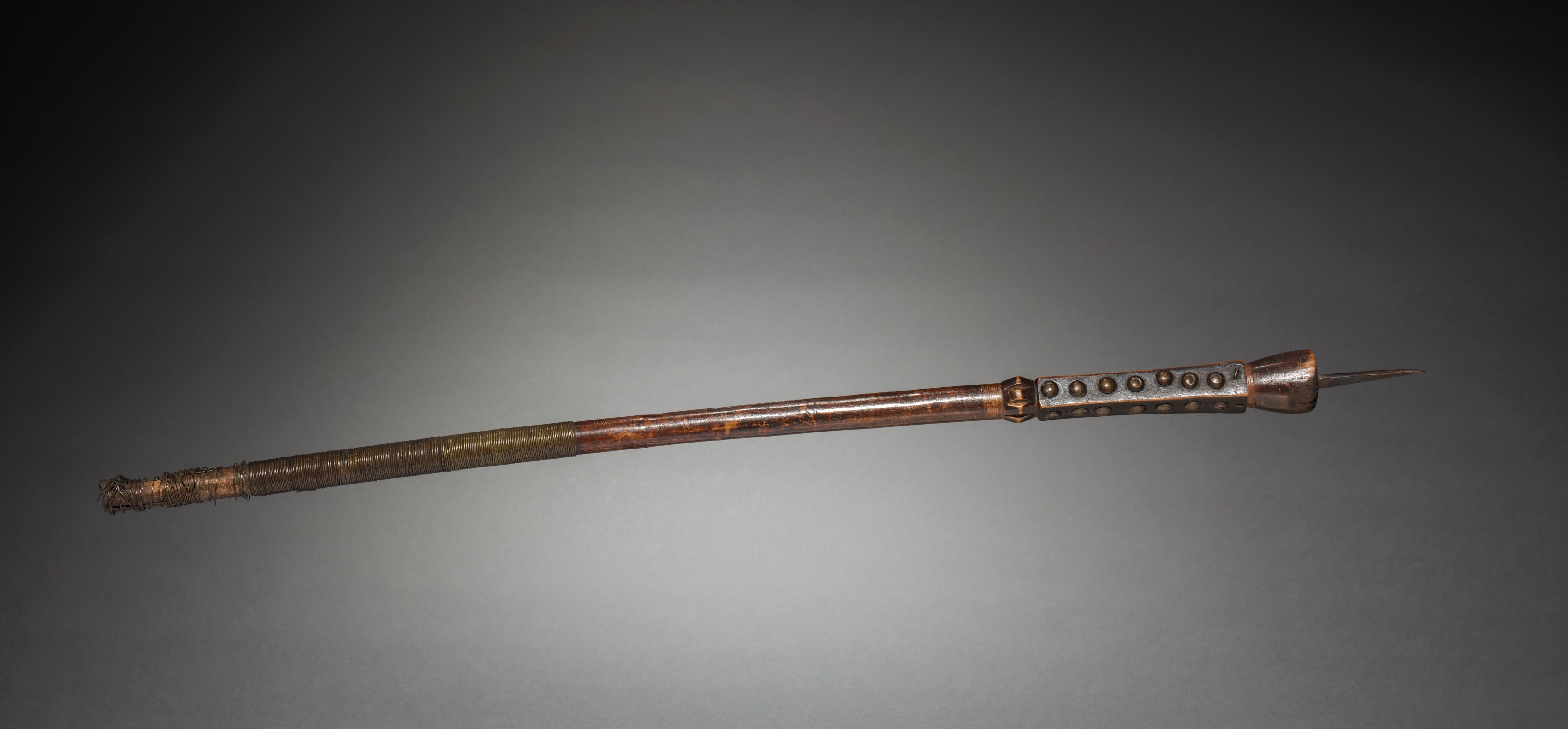 Long, thin, dark brown object with a metal tip and metal accent; metal accent has six small circles; object resembles a spear or javelin; handle wrapped in thin, light brown material; background is dark gray with lighter center.