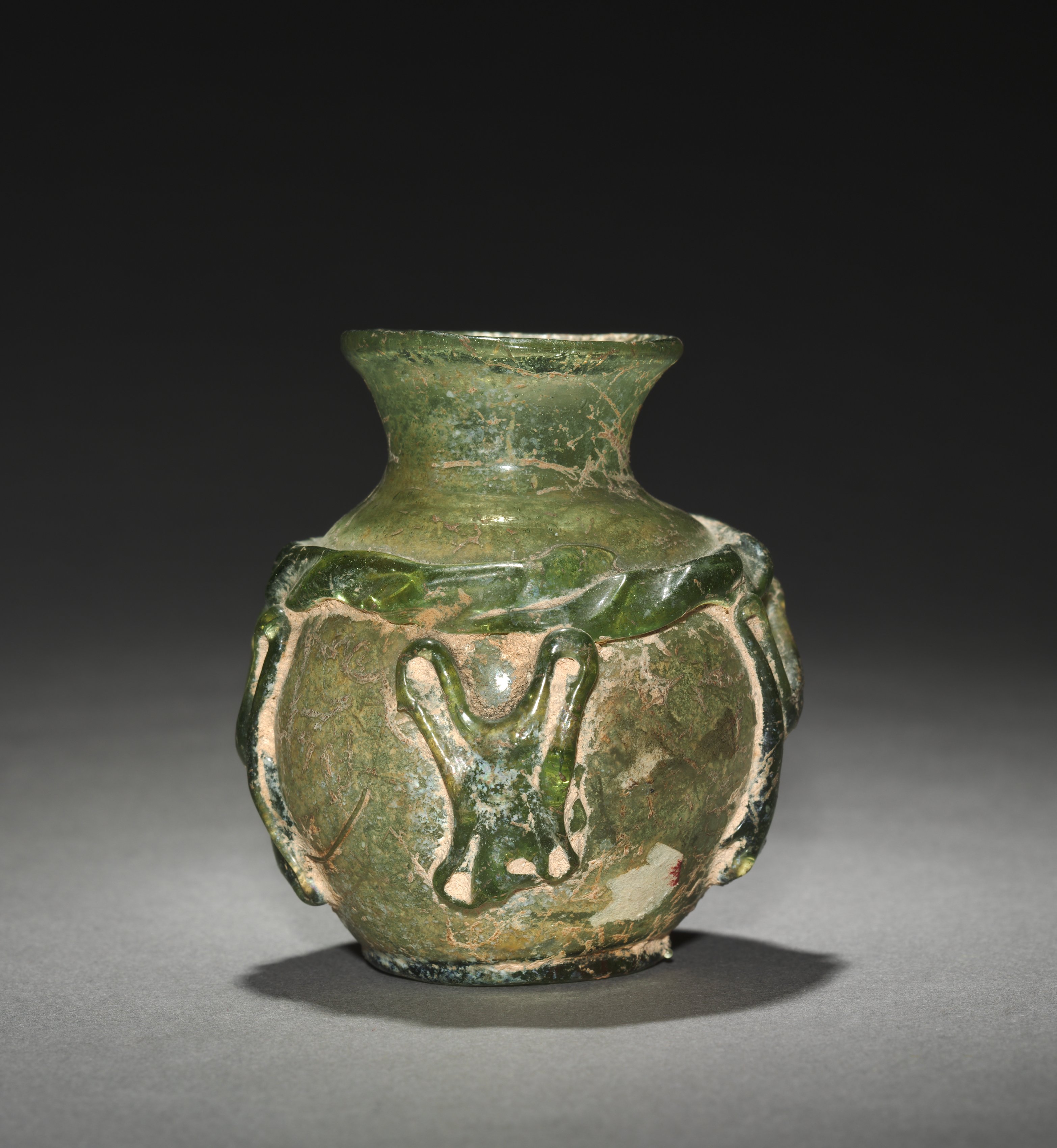 The ceramic vase, by artist Kiyomizu, is green with beige undertones. A glossy green substance resembling glaze covers the vase. The green glaze covers the upper third of the vase and pools at the bottom. A beige clay body shows through where the glaze has chipped. The middle section of the vase features three beige ovals outlined with green glaze and intersected with green lines. The base of the vase comes to a point and has three small feet. The background is dark at the top and light grey at the bottom. A shadow is cast to the right.