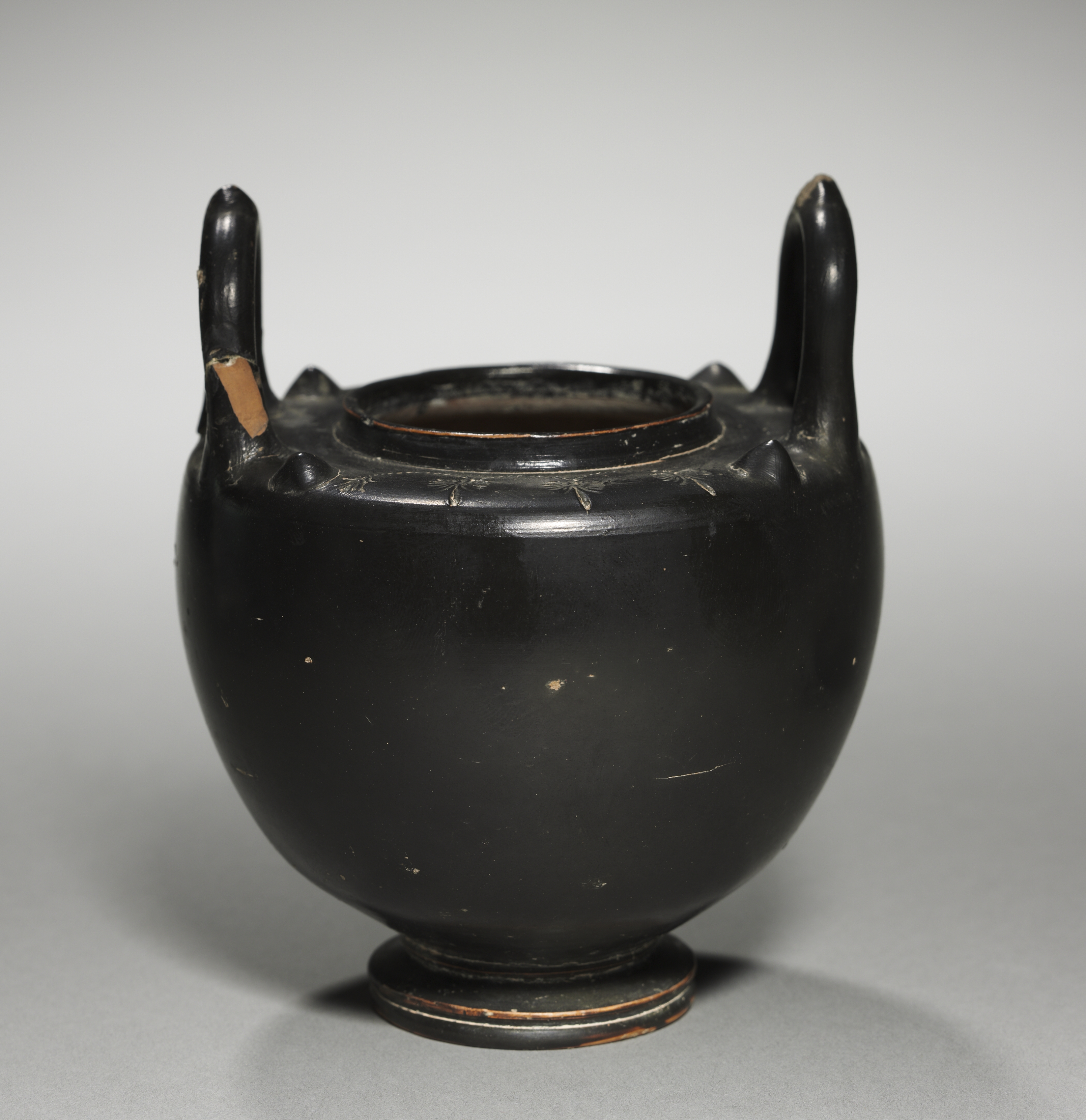 Black-Gloss Lebes Gamikos (Nuptial Bowl) by unknown artist. The object is a black ceramic bowl. The bowl has a wide, rounded body and a narrow base. The base is circular and flat. The bowl has two handles on either side. The handles are long and thin, tapering to a point at the top. The handles are positioned near the rim of the bowl. The rim is rounded. The interior and exterior surfaces are black. The bowl has some scratches and marks on its surface. The background of the image is grey. The bowl casts a shadow on the surface below it.