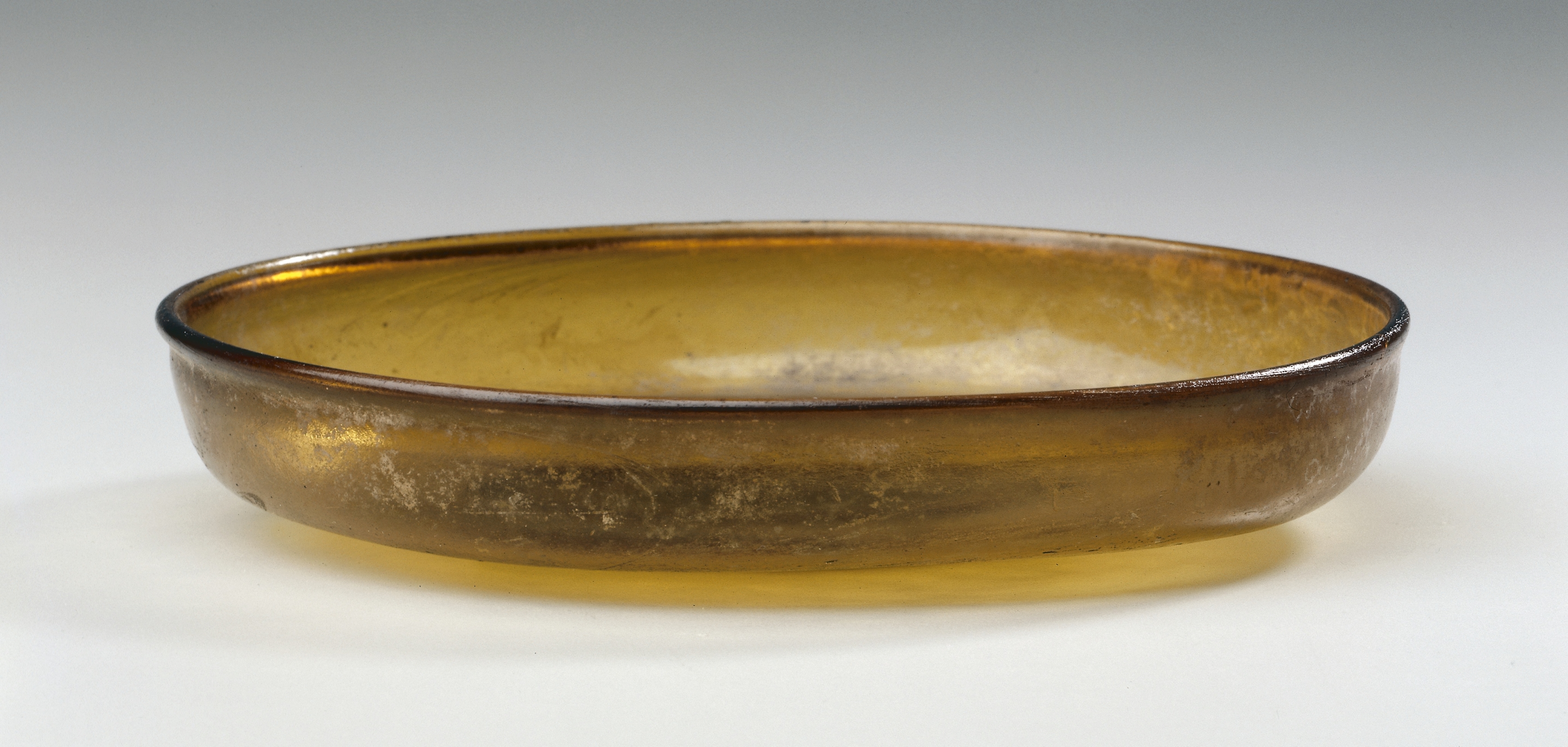 Amber-colored glass bowl, Saucer, by artist unidentified. The bowl has a rounded, shallow shape with a wide mouth and a flat base. Its semi-transparent walls are a uniform amber color with a glossy interior and exterior surface that appears to have small imperfections and tiny bubbles. The bowl's rim is smooth and rounded. The background of the image is white with a slight shadow underneath the bowl.