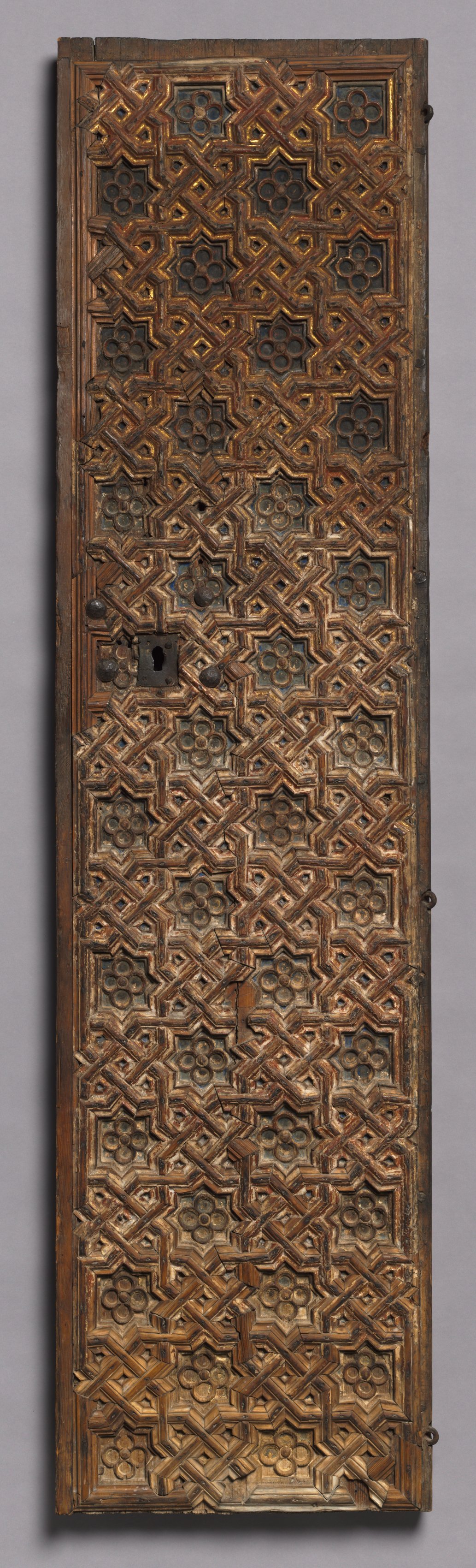 The image shows a vertical rectangular wooden door or panel. The door is made of dark wood with intricate carvings. The carvings form geometric patterns with interlocking shapes. The shapes are primarily octagonal with some square and circular shapes. The carvings are a lighter shade of wood than the rest of the door. There is a keyhole on the left side. A border surrounds the carvings. Small metal protrusions are on the right and left sides. The background is gray.
