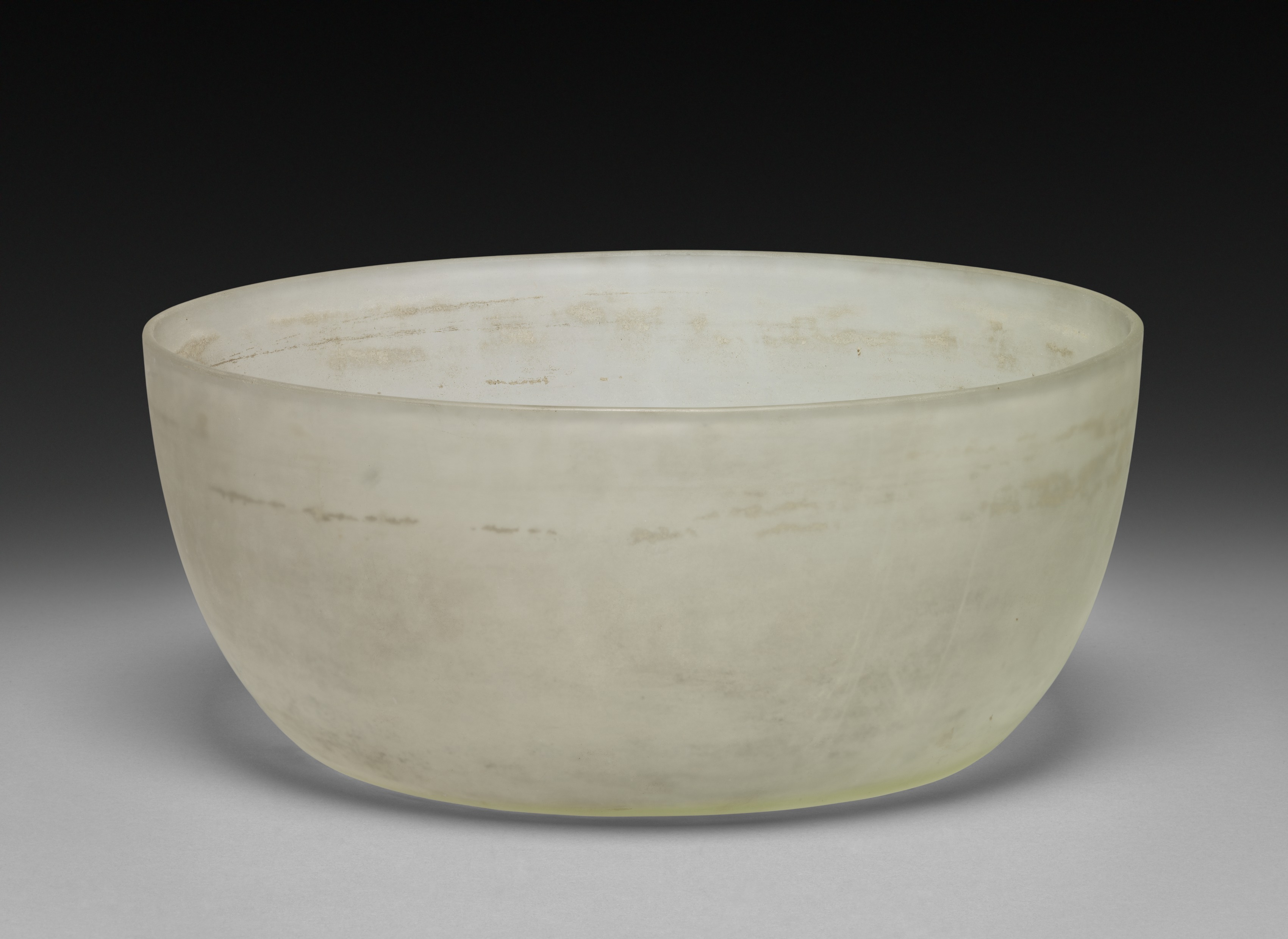 The bowl, by an unspecified artist titled "Bowl", is a white, rounded vessel with a wide mouth and a smooth exterior surface. The bowl's body is made of a semi-translucent material with a subtle sheen. A faint line appears horizontally across the bowl approximately one-third of the way down from the top edge. The bowl's surface exhibits a few darker, thin, irregular lines scattered across it. The background of the image transitions from black at the top to gray at the bottom, with the bowl casting a subtle shadow on the surface below it.