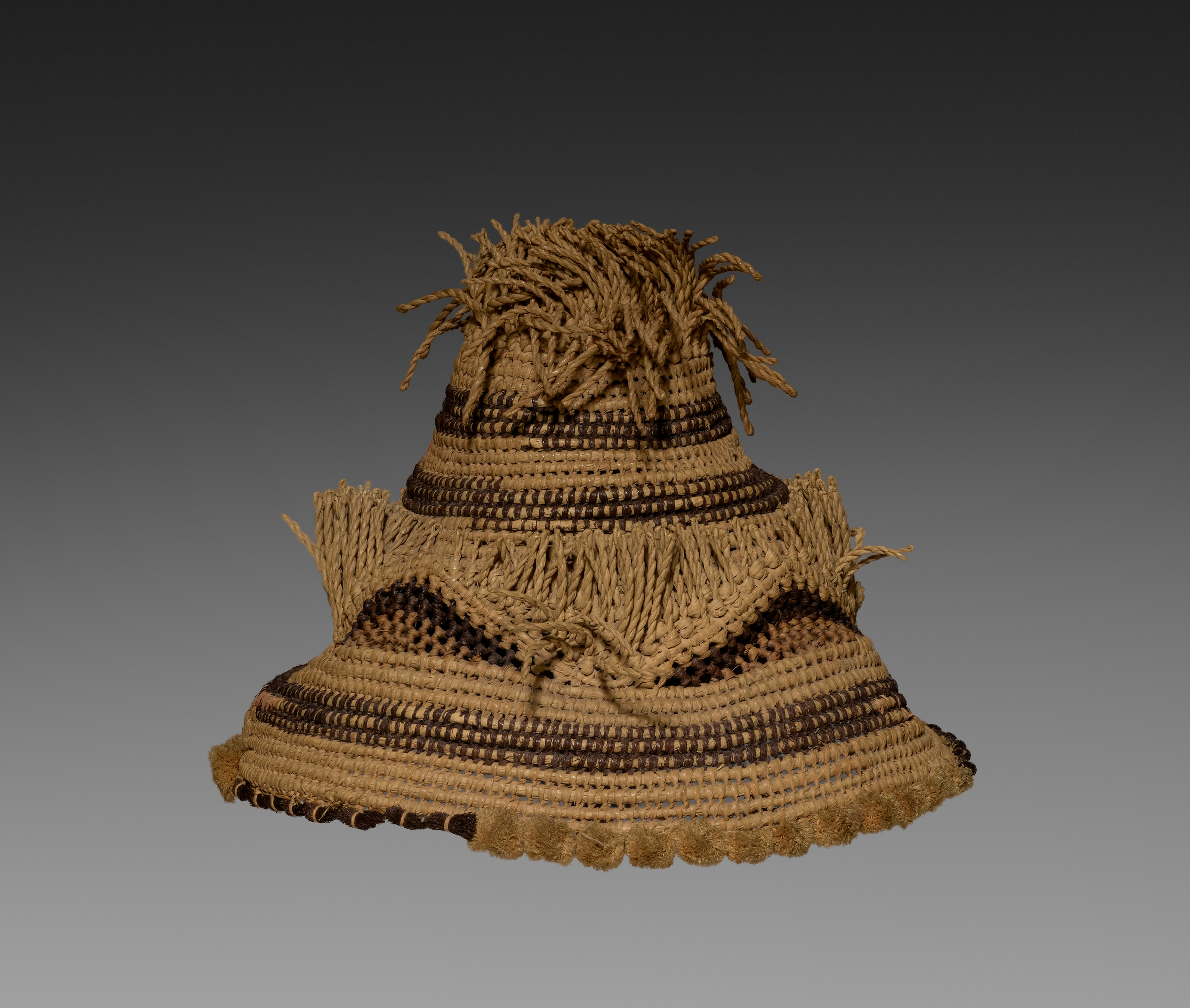The hat "Hat with Pin" by the artist is a woven, straw-colored hat with a wide brim and a tall crown. The hat has a scalloped edge along the bottom of the brim. The crown and brim have multiple horizontal stripes in dark brown. The hat has a fringe around the crown and a longer, shaggy fringe on top. A pin secures the hat. The background is gray.