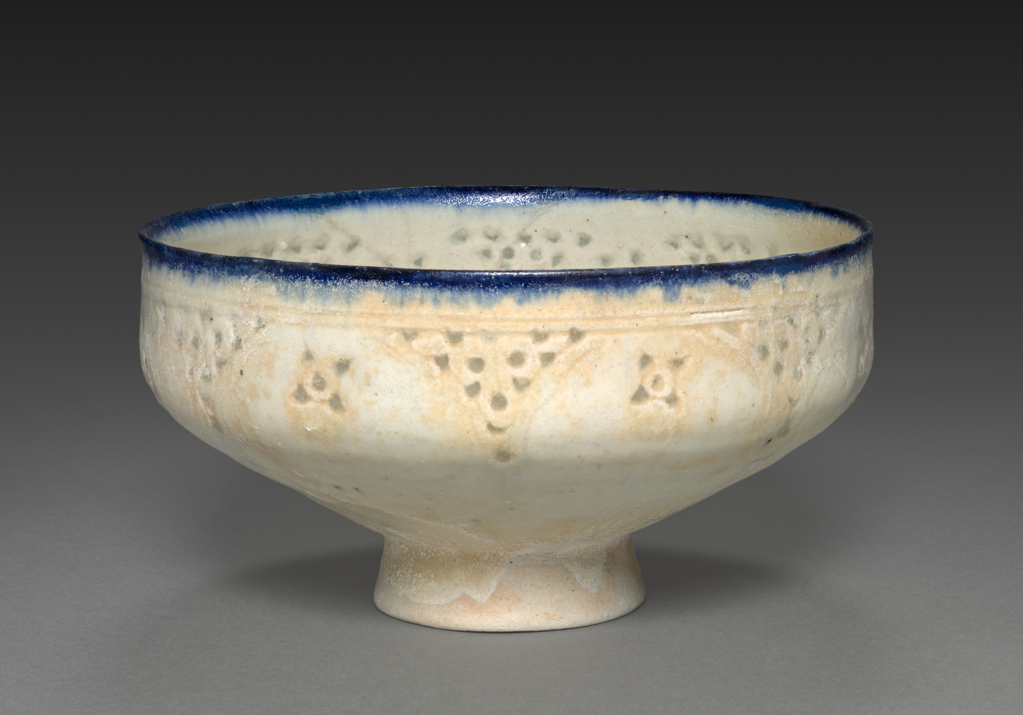 White ceramic bowl with a footed base, featuring a blue rim and a beige and blue glaze; the bowl has a wide mouth and a small foot. The body has raised dots arranged in a triangular pattern. The title of the piece is "Footed Bowl".